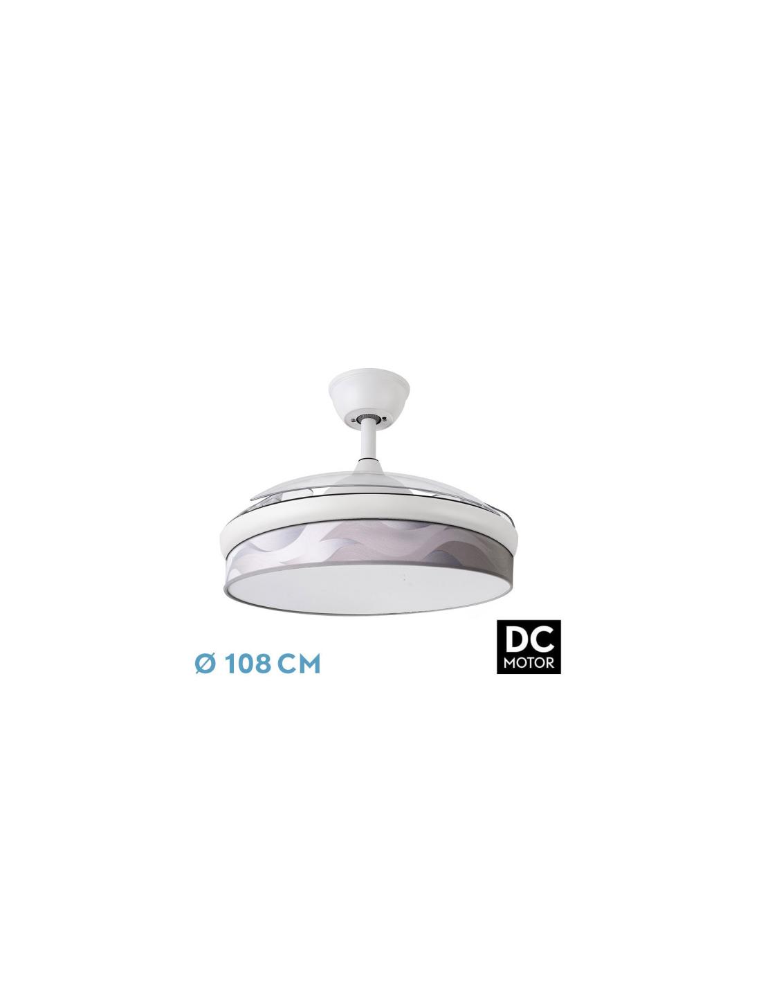 Exclusive and original DC fan from the MODA series with three FOLDABLE ABS blades, in WHITE color with OLA GRAY diffuser. Made of metal, ABS, textile and polycarbonate. Modern and versatile style , the designs and colors of its diffusers make this fan both in operation and in lamp mode only, become the center of attention of the brightening room. Ideal for both modern and classic environments, very much in line with new decoration styles combining colors and textures. DC motor with six adjustable speeds. Integrated LED technology with a power of 72W, 7200 lumens and with 3 SELECTABLE LIGHT TEMPERATURES (3000-4000-6000K). Summer or winter air control. Its measurement is 39/54X49X49 centimeters with the blades folded and 39/54X108X108 centimeters with the blades unfolded, with two seatpost measurements to install it at different heights. Remote control INCLUDED with built-in COLOR MEMORY and 1/2/4 hour TIMER. Model available in both black and white and with a wide variety of designs and colors in its diffusers.