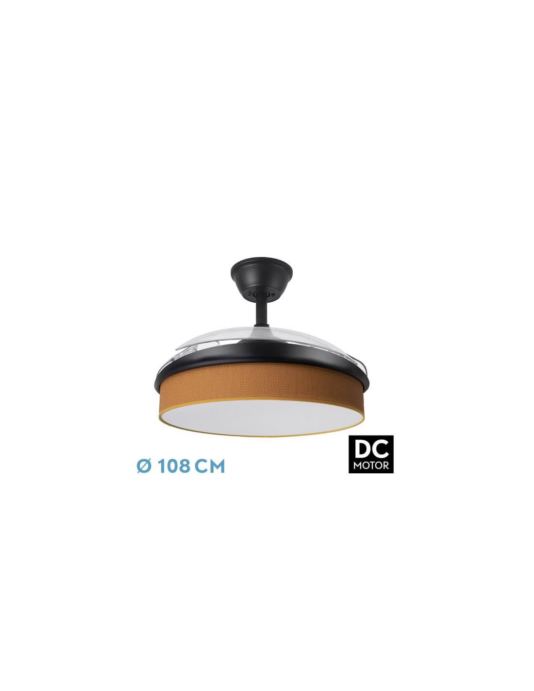 Exclusive and original DC fan from the MODA series with three FOLDABLE ABS blades, in BLACK color with ORANGE diffuser. Made of metal, ABS, textile and polycarbonate. Very modern and versatile design, the designs and colors of its diffusers make this fan both in operation and in lamp only mode, become the center of attention of the room you decorate. Ideal for both modern and classic environments, very much in line with new decoration styles combining colors and textures. DC motor with six adjustable speeds. Integrated LED technology with a power of 72W, 7200 lumens and with 3 SELECTABLE LIGHT TEMPERATURES (3000-4000-6000K). Summer or winter air control. Its measurement is 39/54X49X49 centimeters with the blades folded and 39/54X108X108 centimeters with the blades unfolded, with two seatpost measurements to install it at different heights. Remote control INCLUDED with built-in COLOR MEMORY and 1/2/4 H TIMER. Model available in both black and white and with a wide variety of designs and colors in its diffusers.