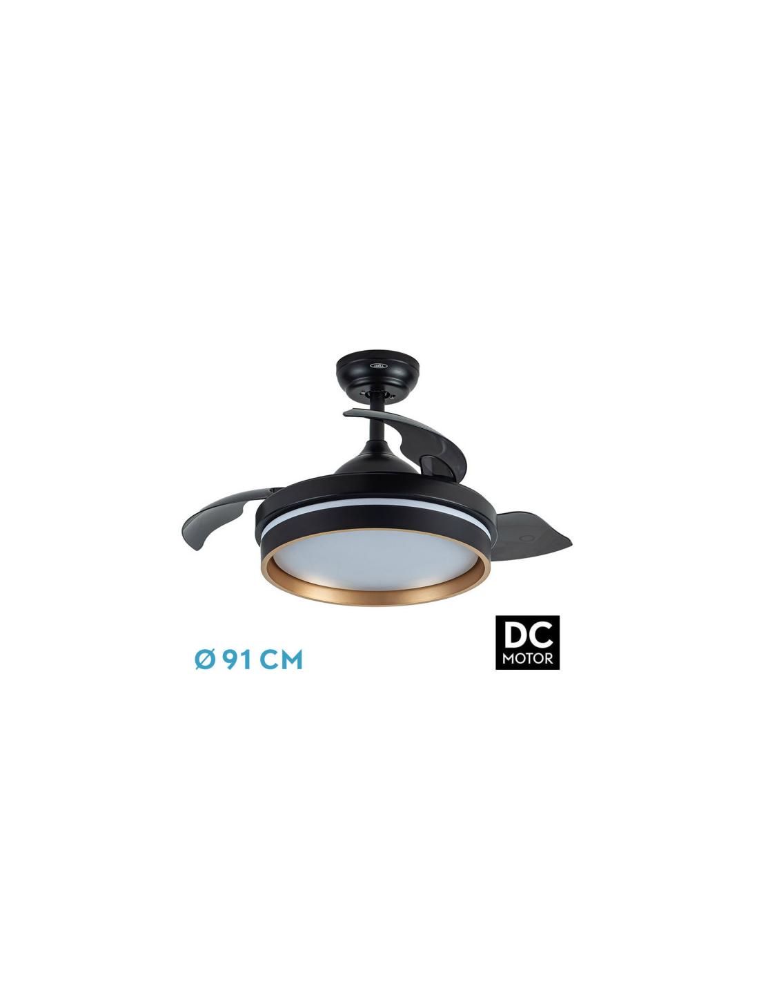 Fan DC from the NALON series in BLACK/GOLD color with three very resistant FOLDING BLADES . Made of metal, ABS and polycarbonate. Very modern and elegant design, updating the way to illuminate and ventilate any room. It has six adjustable speeds. DC motor. Integrated LED technology with a power of 48W, 4800 lumens and 3 SELECTABLE LIGHT TEMPERATURES (3000-4500-6000K), warm light, natural white and cold white. Summer or winter air control. It has dimensions of 40/50x40x40 centimeters with the blades folded and 40/50x91x91 centimeters with the blades unfolded, with TWO SEATPOST MEASUREMENTS included to place at different heights. Remote control INCLUDED with built-in COLOR MEMORY and 1/2/4/8 H TIMER . Model available in two sizes and in white, black/gold, white/beech and black/dark wood.<br/><br/></div>