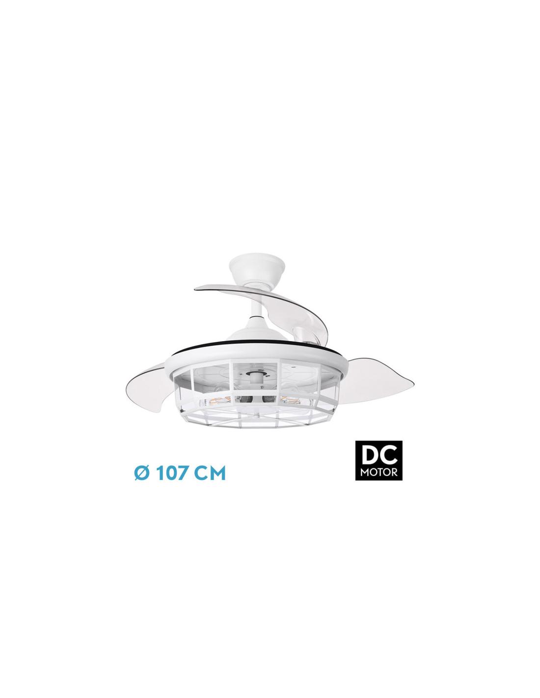 Fan DC from the TORNADO series made of metal and acrylic with a glass effect, in WHITE color with three very resistant transparent ABS RETRACTABLE blades. It has 5 E27 lamp holders, bulbs not included. DC motor, has six adjustable speeds. With a modern design thanks to its folding blades, but very much in line with various decoration styles from classic to Frame House or even Vintage, its finish reminds us of leaded glass lamps, resulting in a very decorative element for living rooms, bedrooms, dining rooms and work areas. It can be used together or indistinctly as a lamp or fan depending on the needs of the room. Remember to remove the protective film that comes with your lampshade. Comes with REMOTE CONTROL, 1/2/4 timer and summer or winter air control. Its measurement is 41/56X50 centimeters with the blades folded and 41/56X107 centimeters with the blades unfolded. Includes two rods of 10 and 25 centimeters, to be placed at different heights. Model available with black, leather or white finishes and in two different sizes to adapt the one that best suits your decoration.