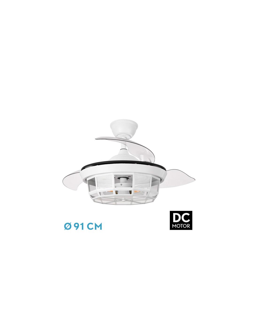 DCFan from the TORNADO MINI series , made of metal and acrylic with a glass effect, in WHITE color with three very resistant transparent ABS RETRACTABLE blades. It has 3 E27 lamp holders, bulbs not included. DC motor, has six adjustable speeds. With a modern design thanks to its folding blades, but very much in line with various decoration styles from classic to Frame House or even Vintage, its finish reminds us of leaded glass lamps, resulting in a very decorative element for living rooms, bedrooms, dining rooms and work areas. It can be used together or indistinctly as a lamp or fan depending on the needs of the room. Remember to remove the protective film that comes with your lampshade. Comes with REMOTE CONTROL, 1/4 timer and air control for summer or winter. Its measurement is 40/55X40 centimeters with the blades folded and 40/55X91 centimeters with the blades unfolded. Includes two rods of 10 and 25 centimeters, to be placed at different heights. Model available with black, leather or white finishes and in two different sizes to adapt the one that best suits your decoration.