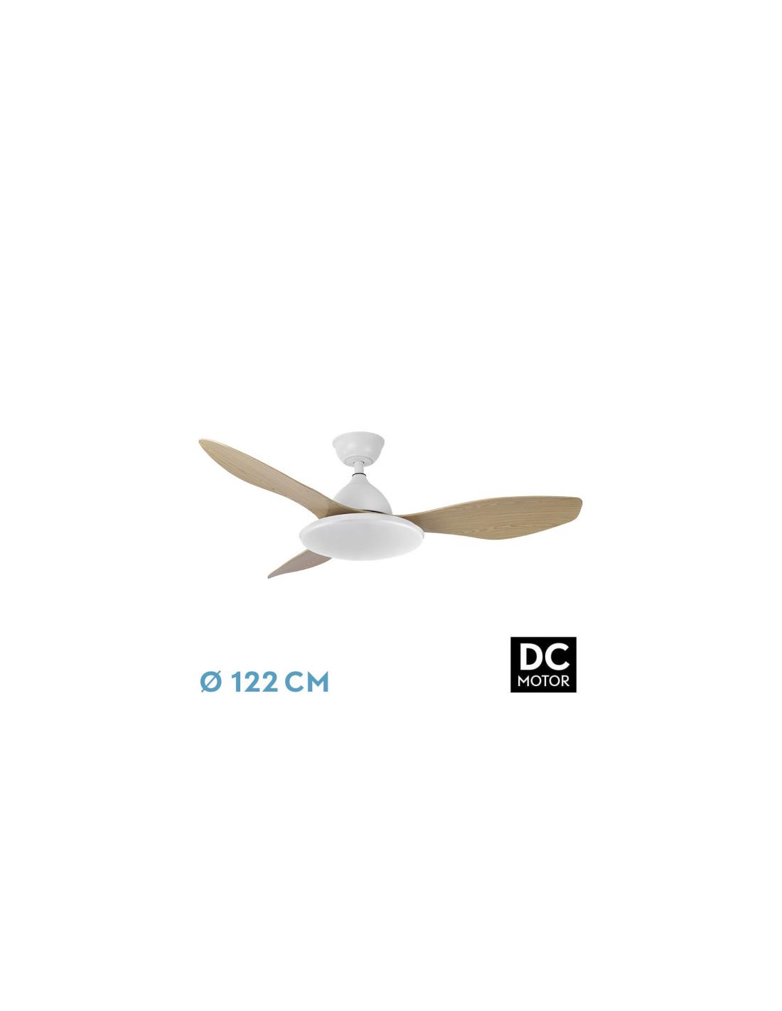 Fan YAEL series DC in WHITE color with 3 HAYA color blades. Made of metal, ABS and polycarbonate. It measures 39/54x122x122 centimeters. Integrated LED technology with a power of 72W, with 3 SELECTABLE LIGHT TEMPERATURES (3000-4000-6000K) and 7200 lumens. Contains remote control with 6 different speeds, color memory, summer/winter mode and timer from 1 to 4 hours. Includes two posts of 10 and 25 centimeters. Model available in white, black and white/beech.