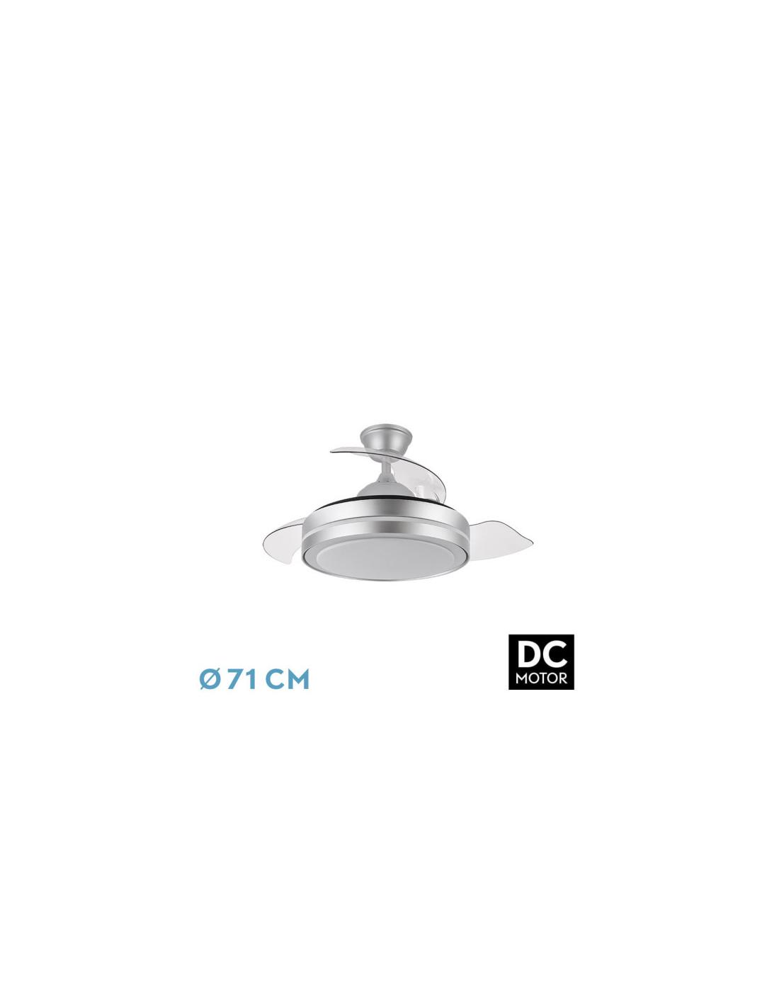 Fan DC from the ESPARTA SMALL series made of metal, polycarbonate and ABS, in SILVER color with three very resistant transparent ABS DEPLOYABLE blades . It has six adjustable speeds. Integrated LED technology with a power of 44W, with 3 SELECTABLE LIGHT TEMPERATURES (3000-4000-6000K) and 5182 lumens. Summer or winter air control. Its measurement is 31.5/43X32 centimeters with the blades folded and 31.5/43X72 centimeters with the blades unfolded. Includes two rods of 10 and 21.5 centimeters, to be placed at different heights. Remote control INCLUDED, with built-in COLOR MEMORY and 1/4 H TIMER. Four sizes available in this series, MAXI, PLUS, MINI and SMALL, with their respective powers and in three colors, white, silver and black, to choose the one that best suits your decoration.