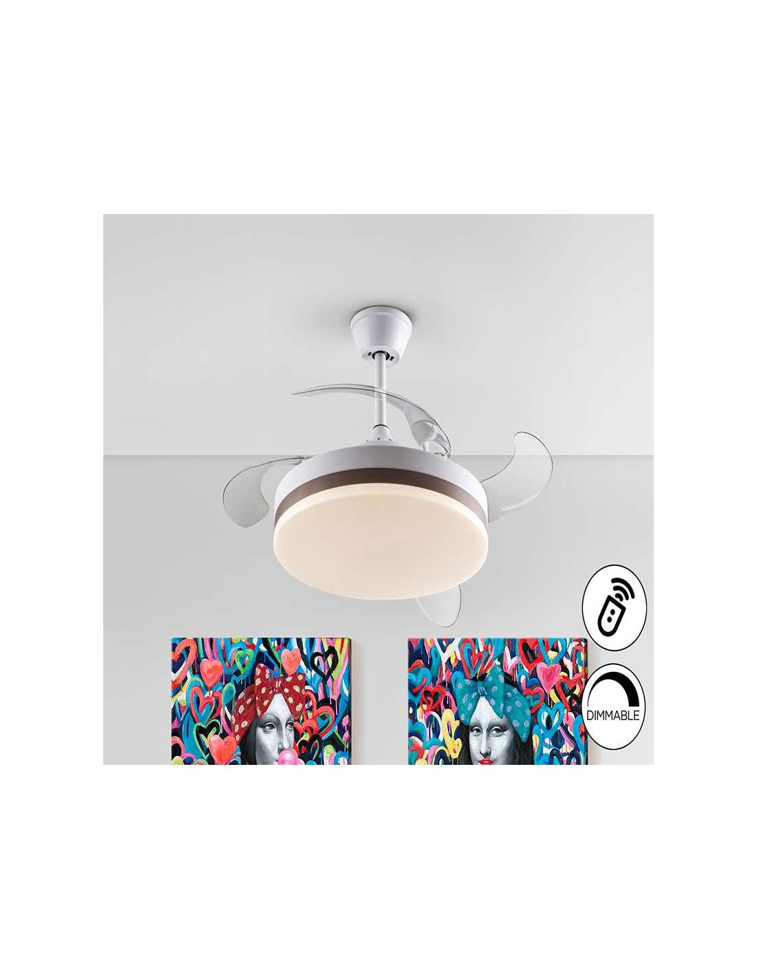 CeilingFan with CCT DIMMABLE LED light made of matte white finished metal and bronze ring. Opal diffuser and retractable smoke blades in acrylic. 6-speed DC motor and reversing. Adjustable color temperature. Timer.