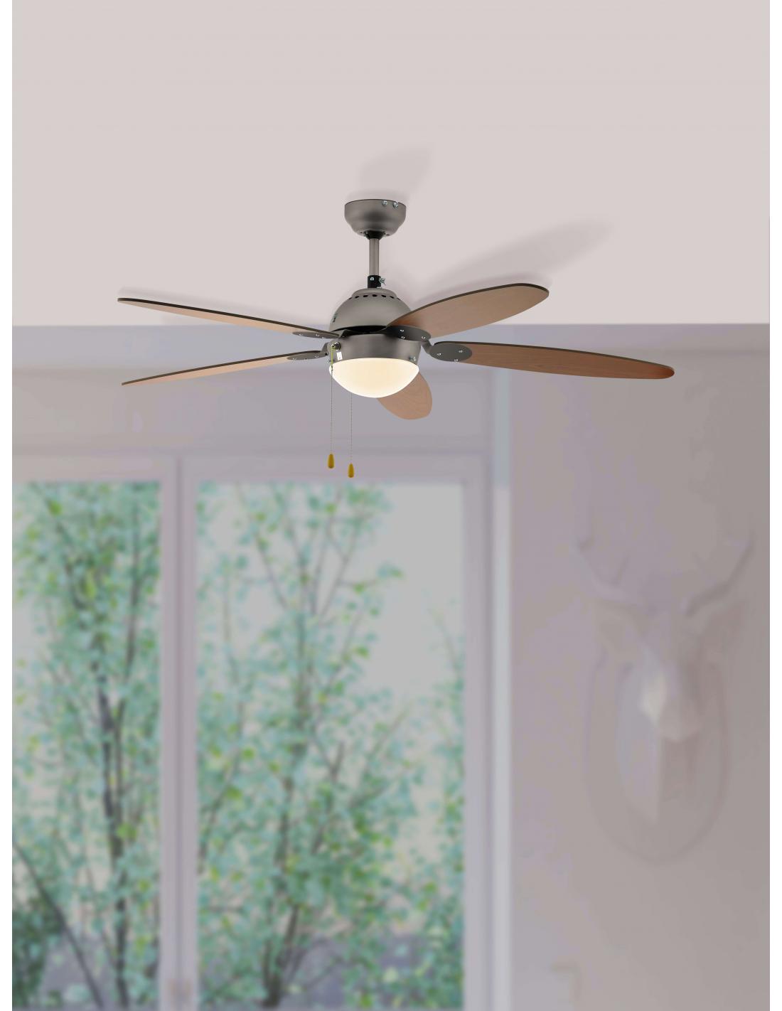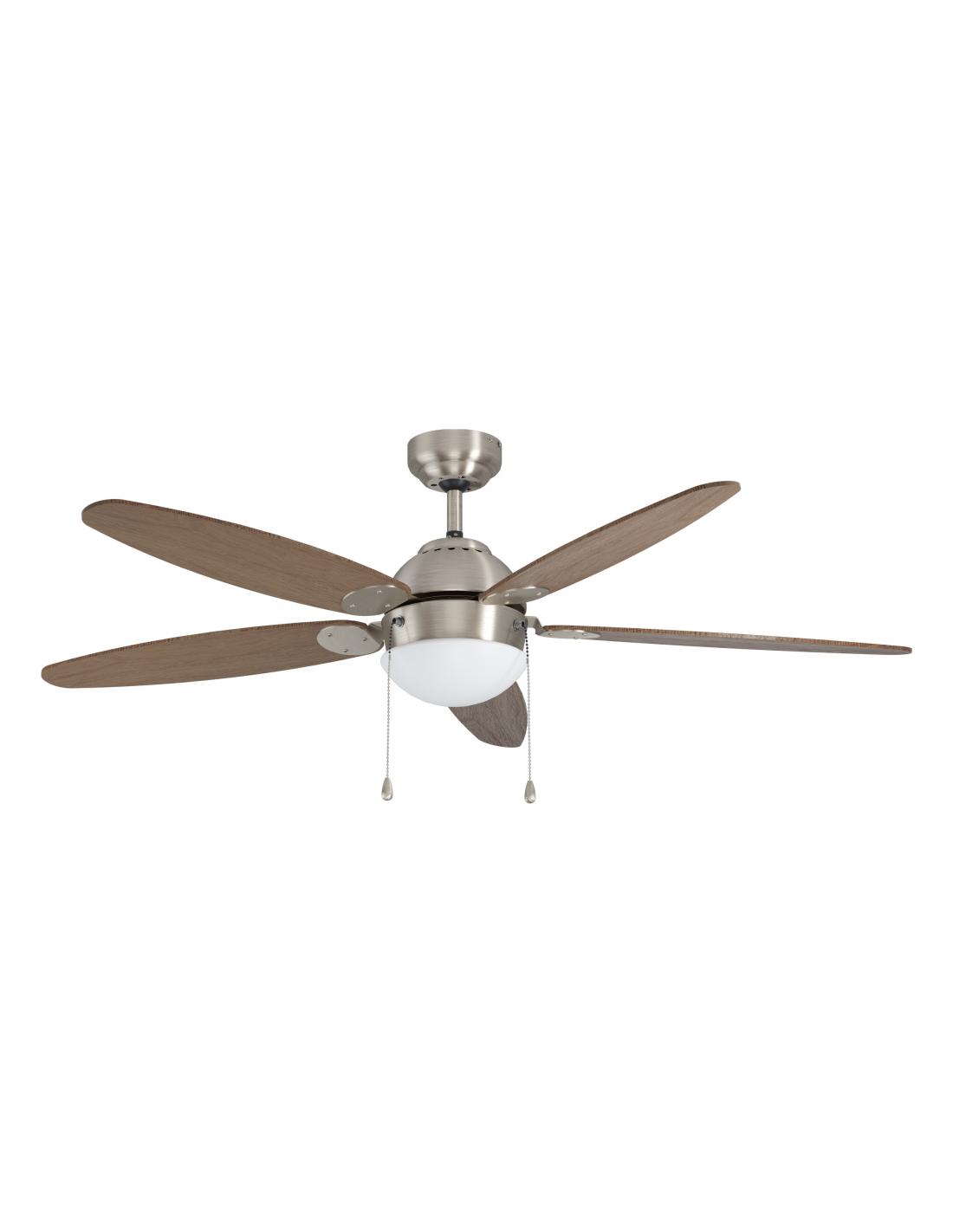 A classic, the SUSALE ceiling fan , with built-in light, has a diameter of 132 cm. It can be used in large rooms. The 5 MDF slats can be rotated and consist of a light or dark brown wooden structure as alternatives. The satin color and the motor housing convey the timeless look of this model. The opal glass shade for E14 bulb guarantees comfortable and glare-free light. Controlled by means of a chain switch, its 3 speeds and light can be switched separately. A selector switch in the same housing allows the ceiling fan to be switched between summer and winter mode.