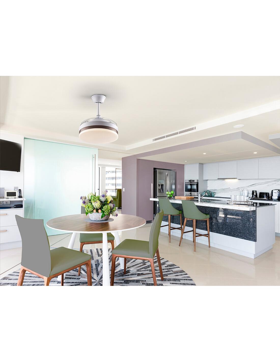 CeilingFan with LED DIMMABLE CCT light in matte white metal finish and bronze ring. Opal diffuser and retractable transparent blades, in acrylic. 6-speed DC motor and reversing. Adjustable color temperature. Timer. Memo function Includes remote control. 24W LED, 1,300 lm, 3,000-4000-6,000 K. Fan: 4-blade propeller. DC 35W Motor. 6 Speeds. Reversible movement. Breeze function. Rumor: 37a 42Db.