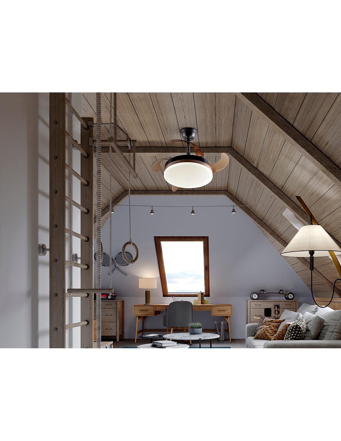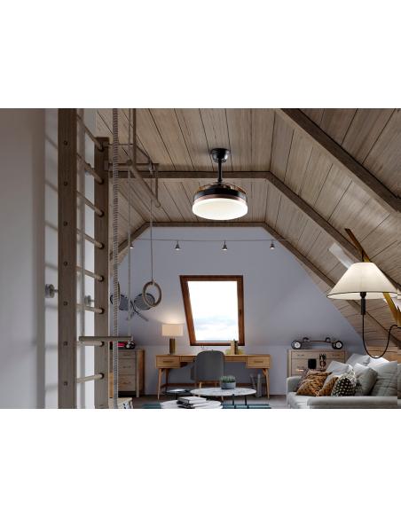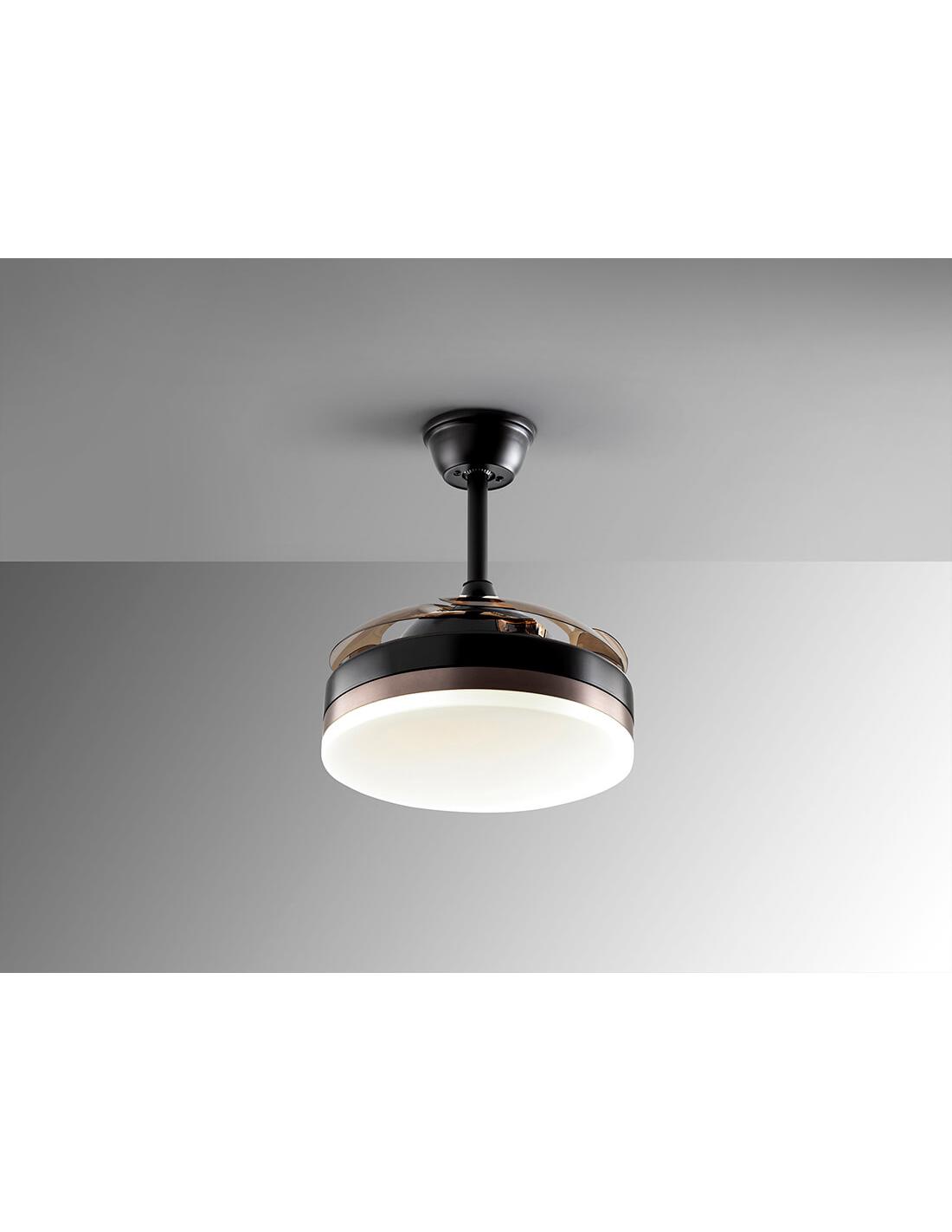 CeilingFan with LED DIMMABLE CCT light in matte black metal finish and bronze ring. Opal diffuser and retractable smoke blades, in acrylic. 6-speed DC motor and reversing. Adjustable color temperature. Timer. Memory function. Includes remote control. 24W LED, 1,300 lm, 3,000-4000-6,000 K. Fan: 4-blade propeller. DC 35W Motor. 6 Speeds. Reversible movement. Breeze function. Rumor: 37 to 42Db.
