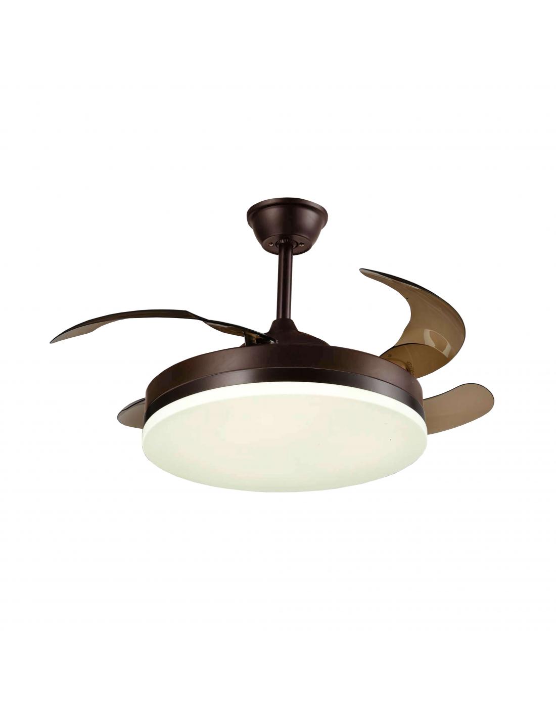 Ceiling Fan with LED DIMMABLE CCT light made of metal with a matte brown finish and a black ring. Opal diffuser and retractable smoke blades in acrylic. 6-speed DC motor and reversing. Adjustable color temperature. Timer. Anti-sway fixing system. Includes remote control. 36W LED, 1,830 lm, 3,000-6,000 K. Fan: 4-blade propeller, Extended Ø100 cm. Action radius: Ø180 cm (measured at 140 cm below the fan). DC Motor 38W. 6 Speeds(185/200/210/225/245/265 rpm). Airflow (215/400/593/741/889/949 m3/h). Reversible movement. Rumor: 37 to 42Db.