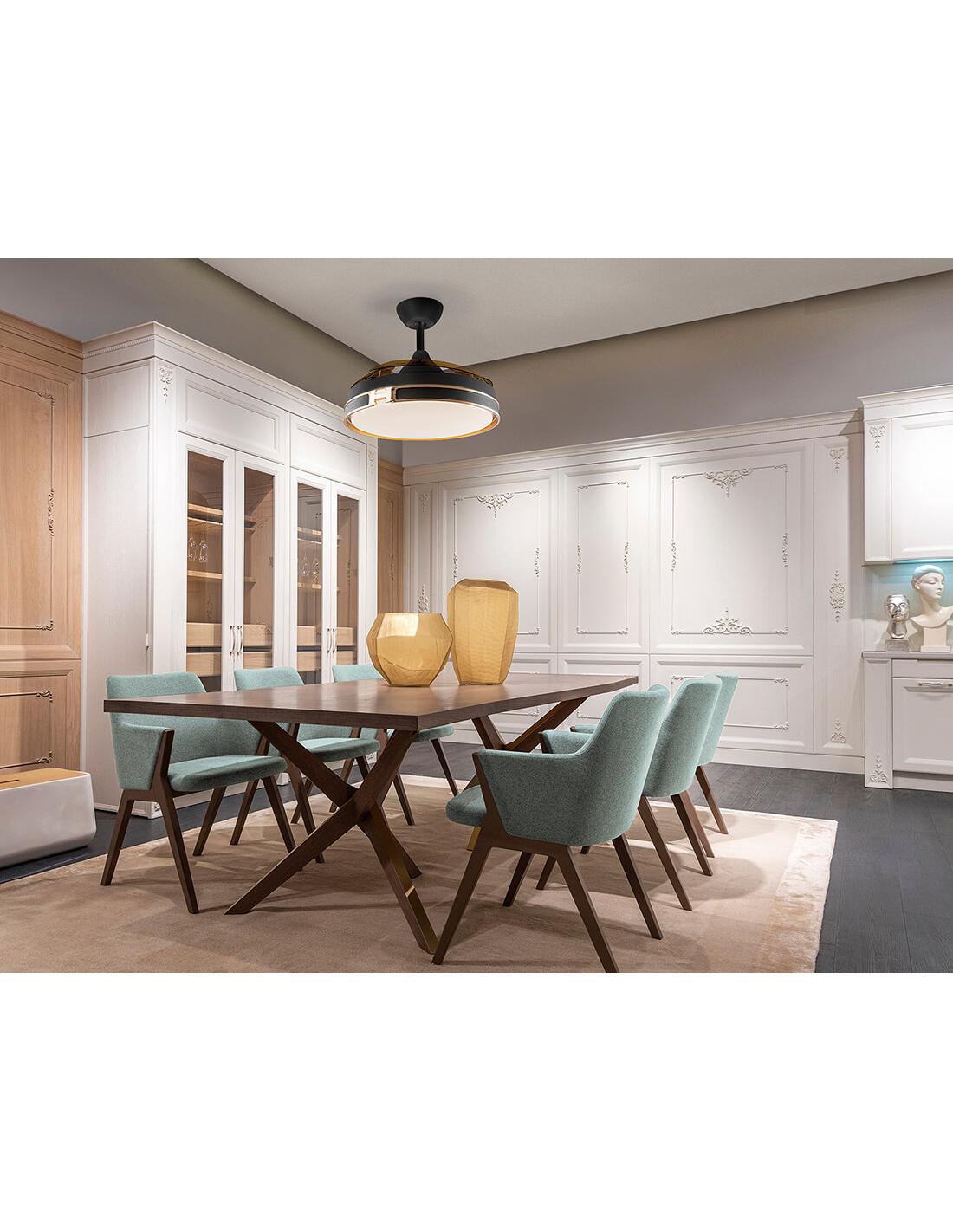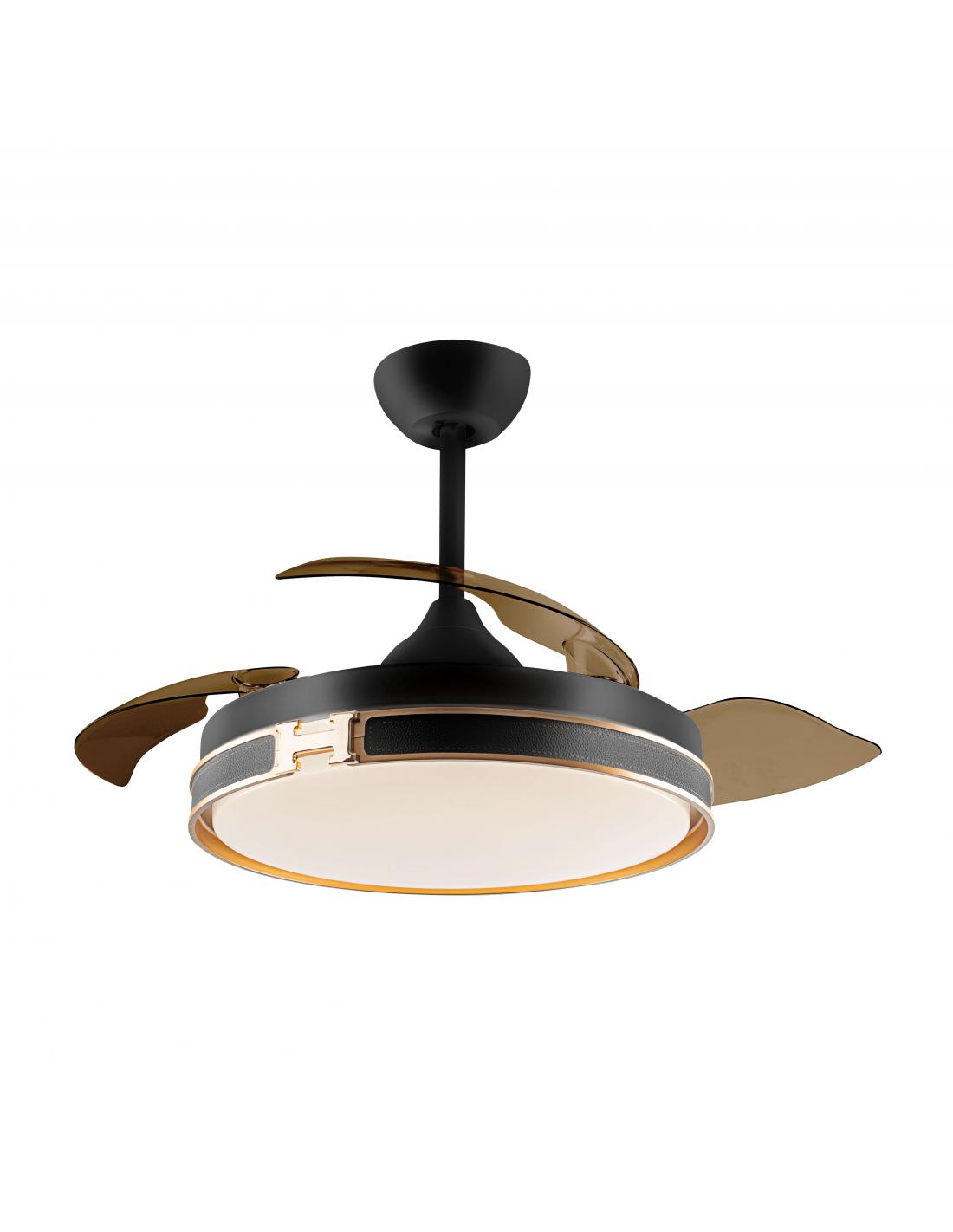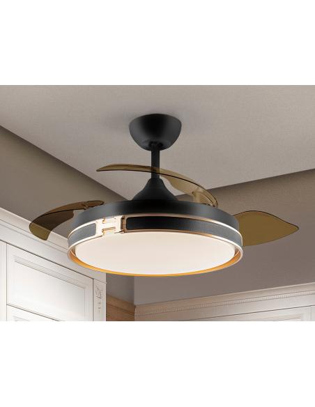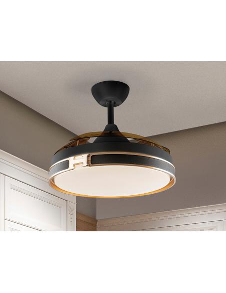 Ceiling Fan with LED DIMMABLE CCT light, 3 light tones. DC Motor: 6 speeds, inversion, timer. Body in matte black finished metal. Golden acrylic and black faux leather hoop. Opal diffuser and retractable transparent blades. Includes remote control. 36W LED, 2,880 lm, 3,000-6,000 K. Fan: 3-blade propeller, Extended Ø107 cm. Action radius: Ø180 cm (measured at 140 cm below the fan). DC Motor 35W. 6 Speeds, Air flow (207/356/504/652/800/964 m3/h). Reversible movement. Rumor: 37/45Db. CE components.