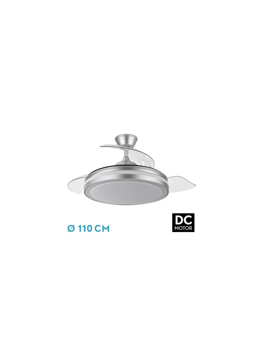 DCFan from the ESPARTA PLUS series made of metal, polycarbonate and ABS, in SILVER color with three very resistant transparent ABS DEPLOYABLE blades . It has six adjustable speeds. Integrated LED technology with a power of 72W, with 3 SELECTABLE LIGHT TEMPERATURES (3000-4000-6000K) and 6120 lumens. Summer or winter air control. Its measurement is 32/47X50 centimeters with the blades folded and 32/47X107 centimeters with the blades unfolded. Includes two rods of 10 and 25 centimeters, to be placed at different heights. Remote control INCLUDED with built-in COLOR MEMORY and 1/4 H TIMER. Model available with a diameter of 132,107,91 and 72 centimeters and all in white, black or silver.