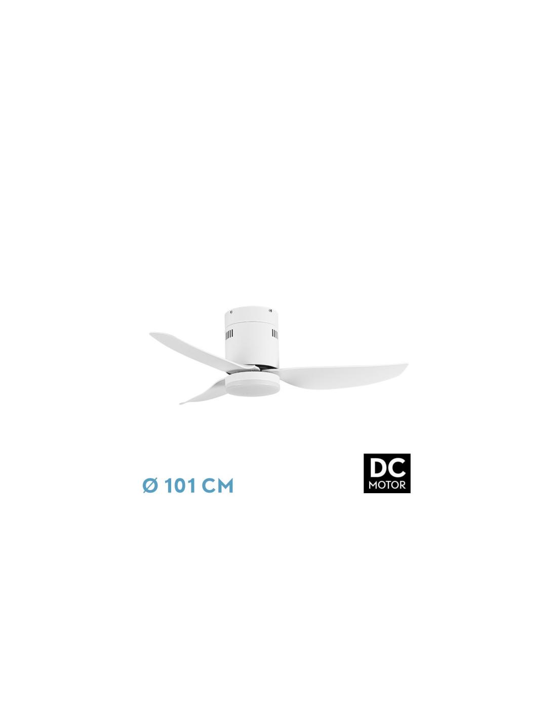 Fan DC BORAX made of metal, ABS and polycarbonate, in WHITE color with three blades. It has six adjustable speeds. Built-in LED technology with a power of 20W, with 3 LIGHT TEMPERATURES (3000-4000-6500K) and 2350 lumens. Its measurement is 27X101X101 centimeters. Summer and winter air control. Remote control INCLUDED with built-in COLOR MEMORY and 1/2/4 H TIMER. Model available in White/Beech, White and Black.