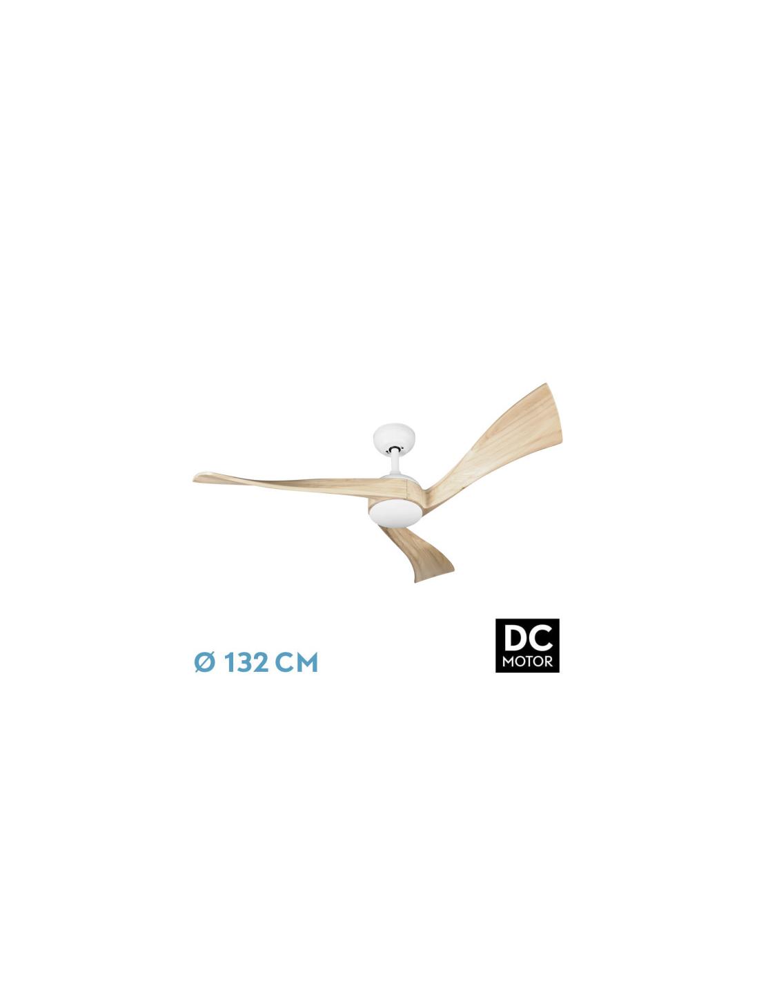 Fan DC from the JANUBI series in WHITE color and three blades in HAYA color. Made of metal, wood and glass. DC motor with six speeds. It has integrated LED TECHNOLOGY with 22 watts of power, 2350 lumens and THREE SELECTABLE LIGHT TEMPERATURES 3000-4000-6000k (warm, natural white and cold white). Its dimensions are 35/47.5x132x132 centimeters, with two stem measurements to install at different heights. It comes with REMOTE CONTROL included with INTENSITY REGULATOR, COLOR MEMORY and TIMER to select that the fan turns off automatically from 30 minutes to 2 hours. Summer/winter air control. Available in this series in white/beech, black/oak and nickel/beech.