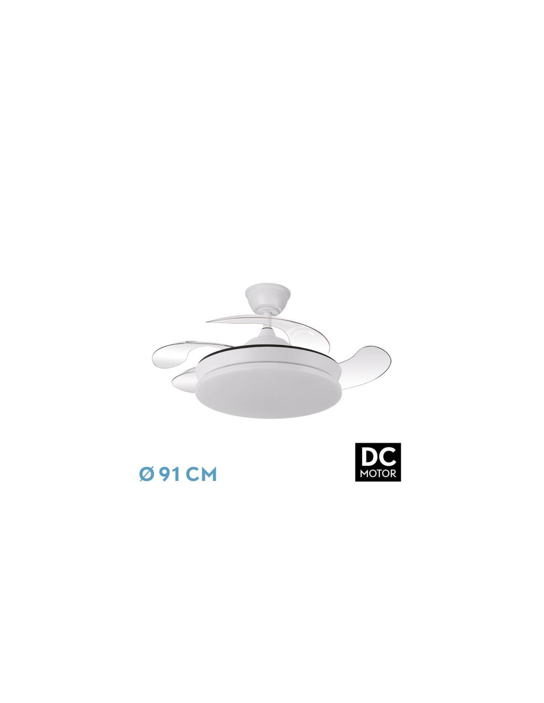 Fan DC from the TRIDENTE MINI series made of metal, polycarbonate and ABS, in WHITE color with four very resistant transparent ABS DEPLOYABLE blades . Innovative design, ideal to complete both modern and classic decorations, performing both the function of lamp and fan. DC motor with six adjustable speeds. Integrated LED technology with a power of 59W, 6980 lumens and 3 SELECTABLE LIGHT TEMPERATURES (3000-4000-6000K) warm, natural and cold white light. It is ADJUSTABLE IN INTENSITY, with remote control INCLUDED with built-in COLOR MEMORY and 2/4 H TIMER. Summer or winter air control. Its measurement is 34.5/42X40 centimeters with the blades folded and 34.5/42X91 centimeters with the blades unfolded. Includes two rods of 12.5 and 20 centimeters, to be placed at different heights. We find in this series two sizes of fans and in the colors white, black, nickel and leather, to choose the one you like the most and the one that best suits your decoration.