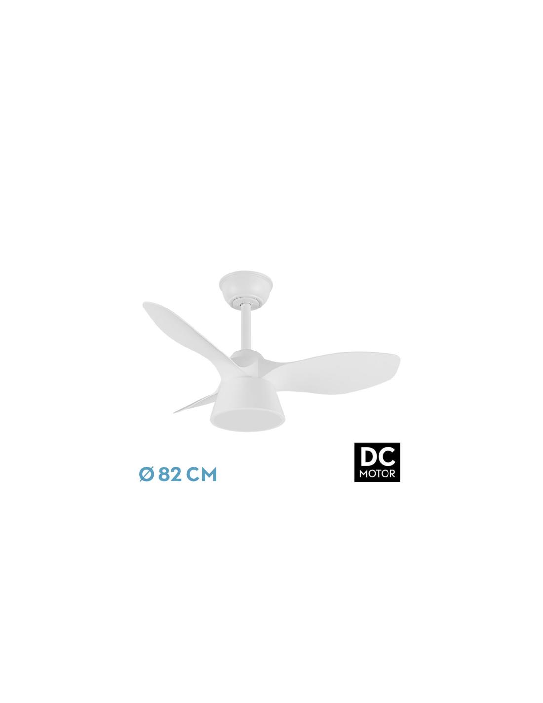 DCFan from the CUBICO series made of metal, ABS and polycarbonate, in WHITE color with three blades. DC motor. It has six adjustable speeds. INTEGRATED LED technology with a power of 36W, with 3 SELECTABLE LIGHT TEMPERATURES (3000-4500-6000K), warm light, natural white and cold white, and 2680 lumens. Modern and very original design. Its measurement is 31/46x82x82 centimeters, with two SEATPOST measurements to install at different heights. Summer or winter air control. REMOTE CONTROL INCLUDED with built-in COLOR MEMORY and 1/2/4 H TIMER. Model available in white/beech, black and white.