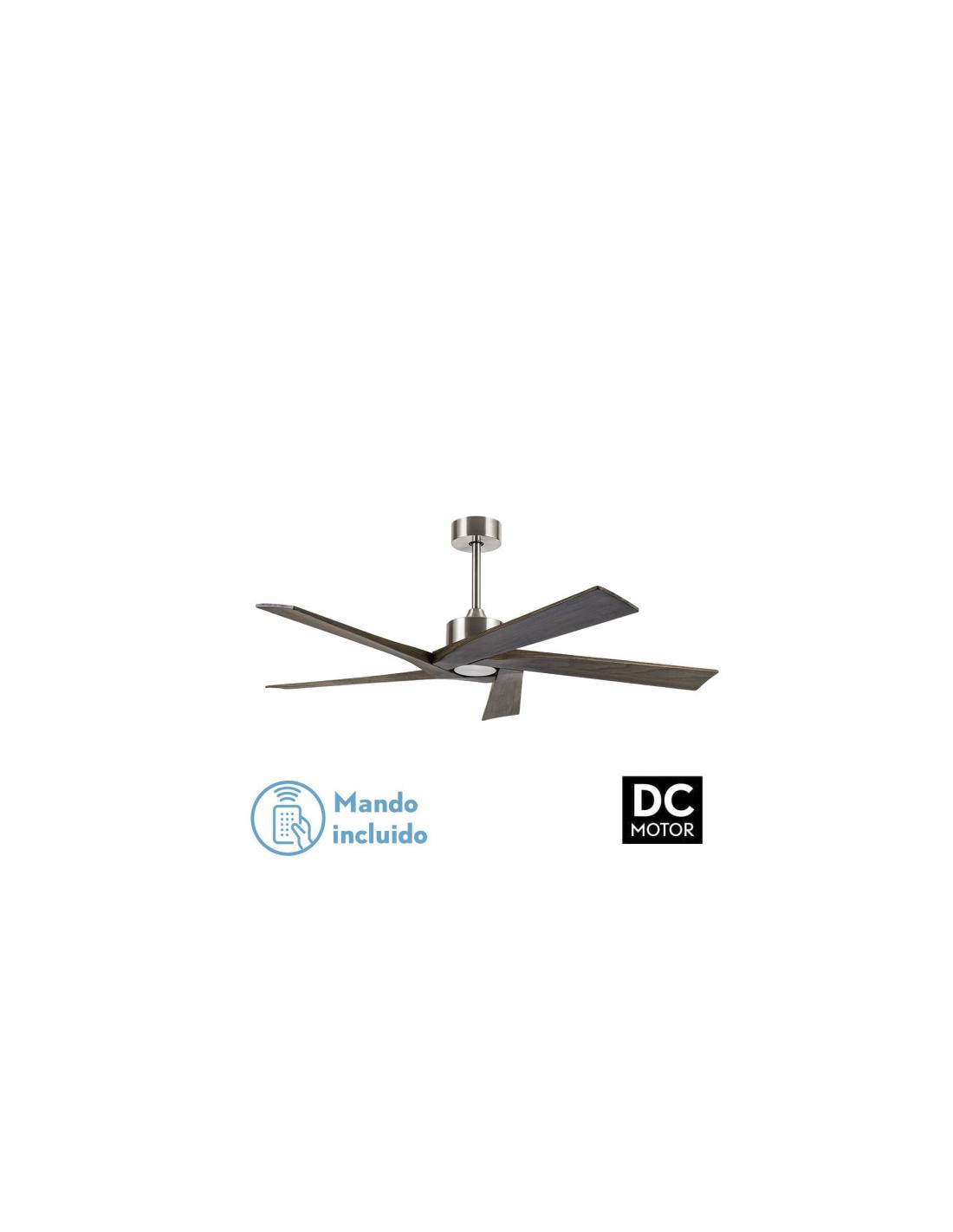 Fan NADIR without built-in light, made of metal and wood, in NICKEL color with 5 RUSTIC color wooden blades. DC motor. It has 6 adjustable speeds. Its measurement is 45.3/55.3x142.2x142.2 centimeters. Includes two 15 and 25 centimeter seatposts Air control summer or winter. Remote control INCLUDED with TIMER 1/4/8 H. Model also available in Black/Walnut.