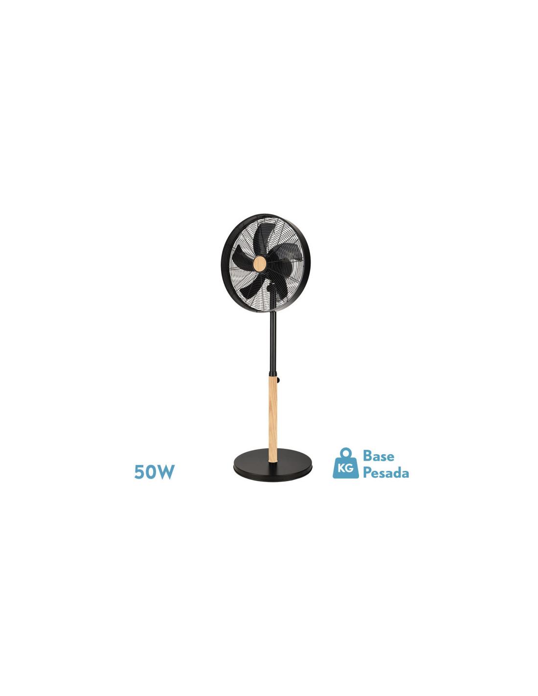 FALCON series Standing Fan in BLACK/BEECH color with five blades and three speeds. Made of metal and ABS. AC motor. It has a power of 50 watts. Two positions, fixed and rotary, allowing the ventilation area to be expanded, also oscillating, redirecting the air to the desired area depending on the needs of the room. Modern design , combining colors and textures to suit your decor. Easy to handle and assemble, it has a round base for greater stability. It has dimensions, with adjustable height, of 85<,120x45x37 centimeters. Matching in this series is the standing fan and the desktop fan.
