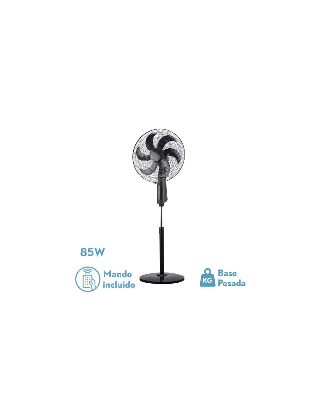Standing Fan from the TOLON series in BLACK color with six blades and three speeds. Made of aluminum and polycarbonate. AC motor. It has a power of 85 watts. Two positions, fixed and rotating, also oscillating, being able to redirect the air to the desired area and expanding the ventilation area depending on the needs of the room, with THREE AIR MODES (NATURAL, SLEEP AND NORMAL). Comes with REMOTE CONTROL included and TIMER to program the fan to turn off by itself until 9 am, providing great energy savings. Simple design and easy handling, it has a round and heavy base for greater stability. It has dimensions, adjustable in height, of 110<,140x50x43 centimeters.