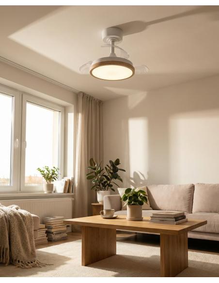 The MALPICA ceiling fan in white/oak stands out for its compact dimensions of Ø 330/630 mm and a height of 300 mm. With a 14.5 watt DC motor, an airflow of 3500 m³/h, as well as an LED power of 18 watts, 2700 lumens and adjustable white light, it combines efficient air circulation with flexibly adjustable lighting.
