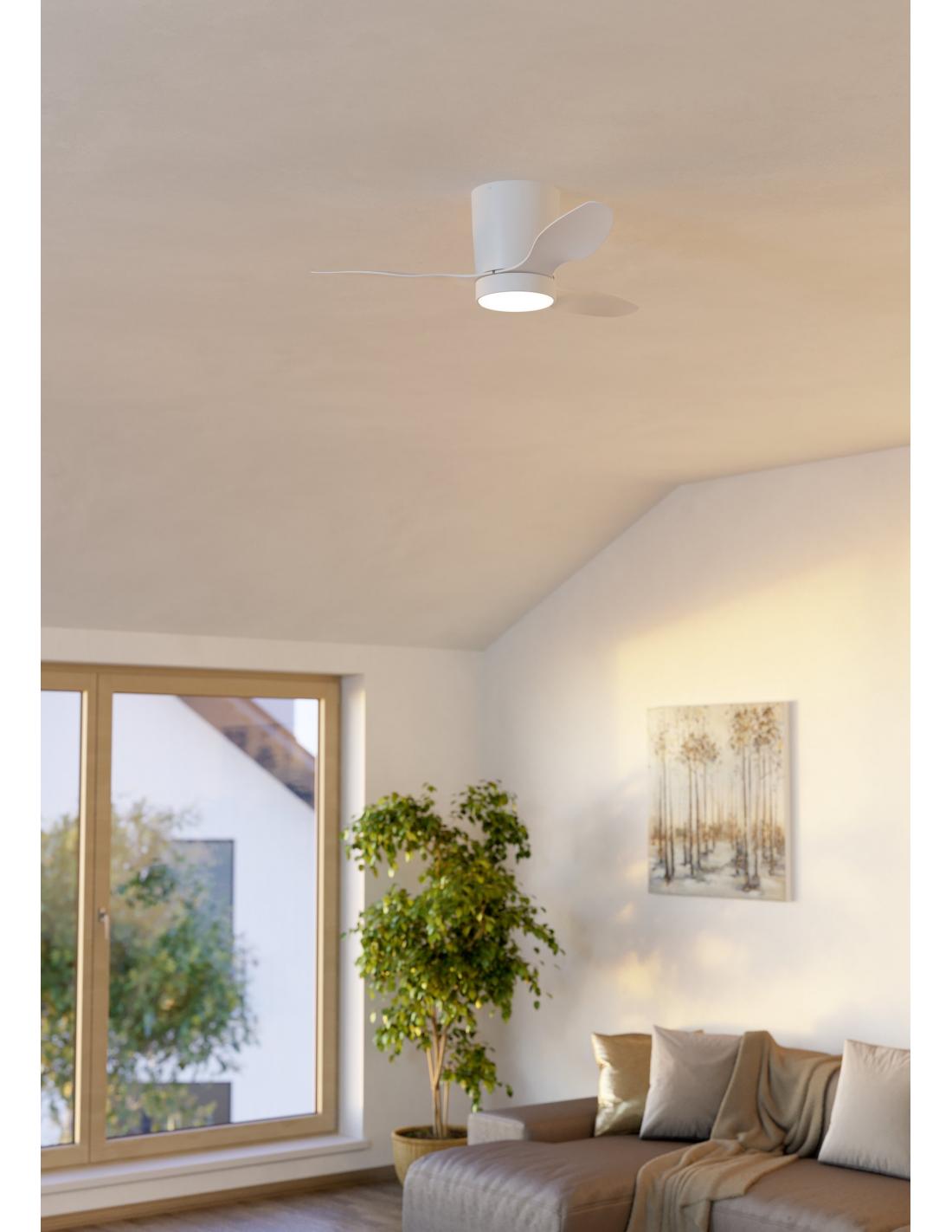 The BARCARÈS ceiling fan in white impresses with compact dimensions of Ø 910 mm and a height of 260 mm. With a 19-watt DC motor, an airflow of 6000 m³/h and an LED power of 20 watts, 3000 lumens and Tunable White, it combines efficient air circulation with flexibly adjustable lighting.