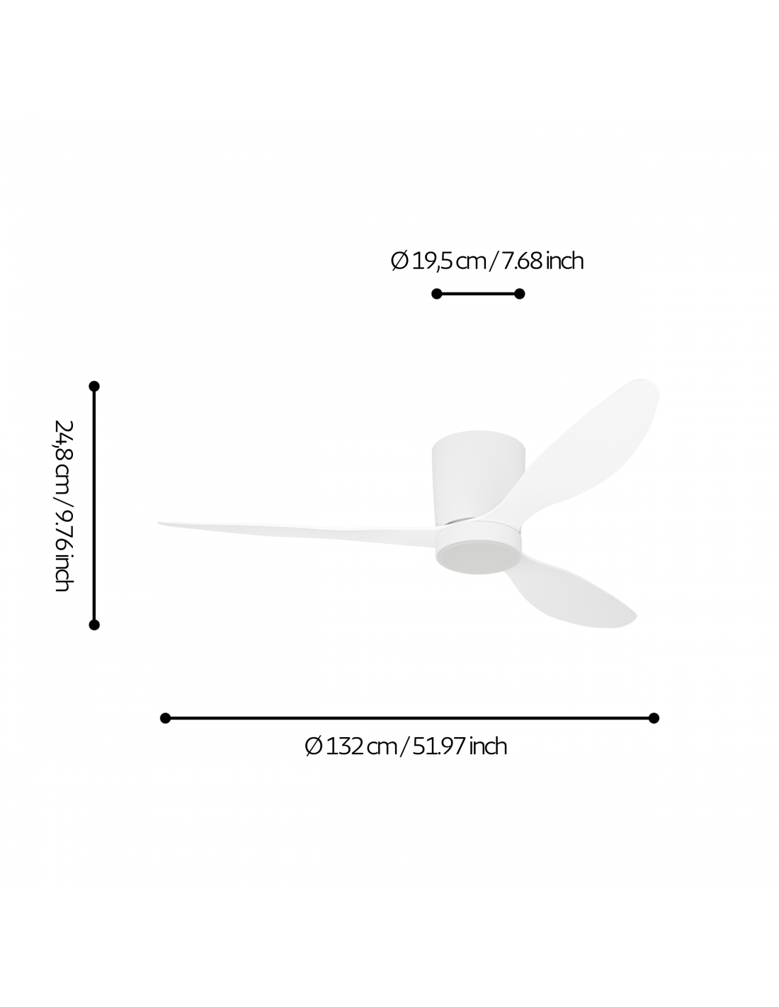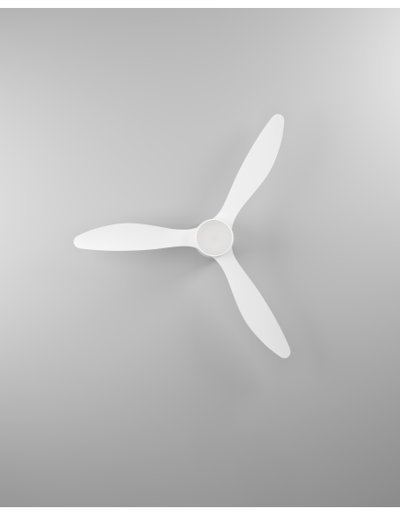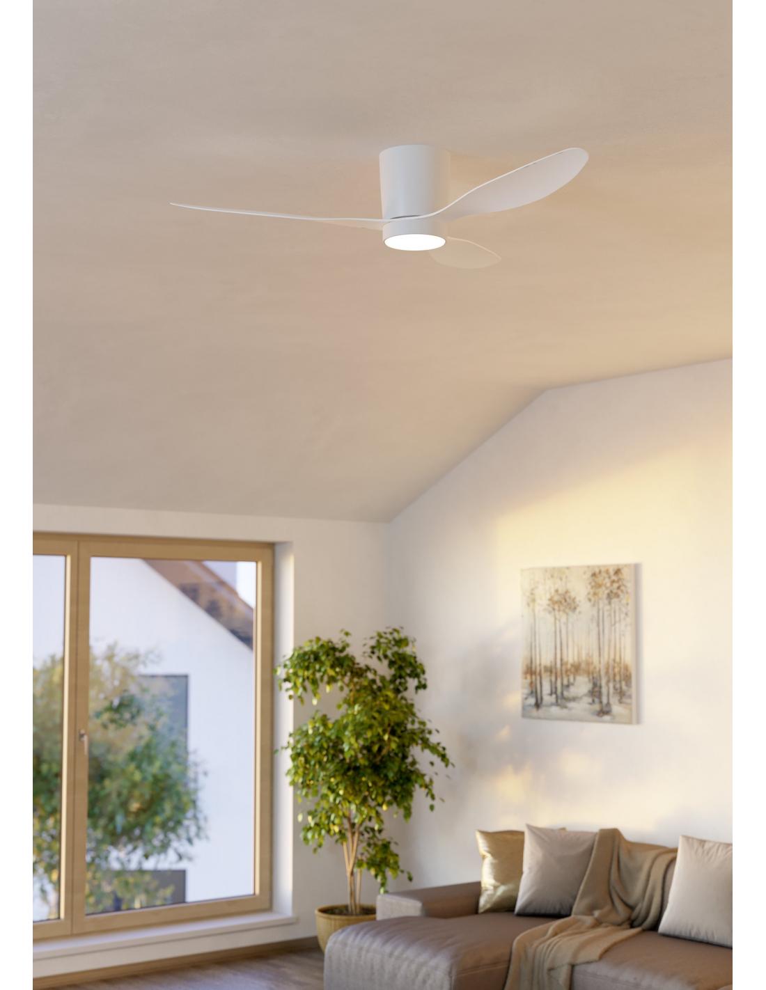 The BARCARÈS ceiling fan in white stands out for its generous dimensions of Ø 1320 mm and a height of 350 mm. With a 27-watt DC motor, an airflow of 10,800 m³/h, as well as an LED power of 20 watts, 3000 lumens and adjustable white light (Tunable White), it combines powerful air circulation with flexible and dimmable lighting.