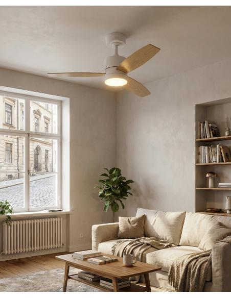 The MANDAREE ceiling fan in white/oak impresses with a diameter of 1060 mm and a height of 380 mm. With a 25-watt DC motor, an airflow of 7500 m³/h, as well as an LED power of 20 watts, 3000 lumens and adjustable white light, it combines powerful air circulation with flexibly adjustable lighting.