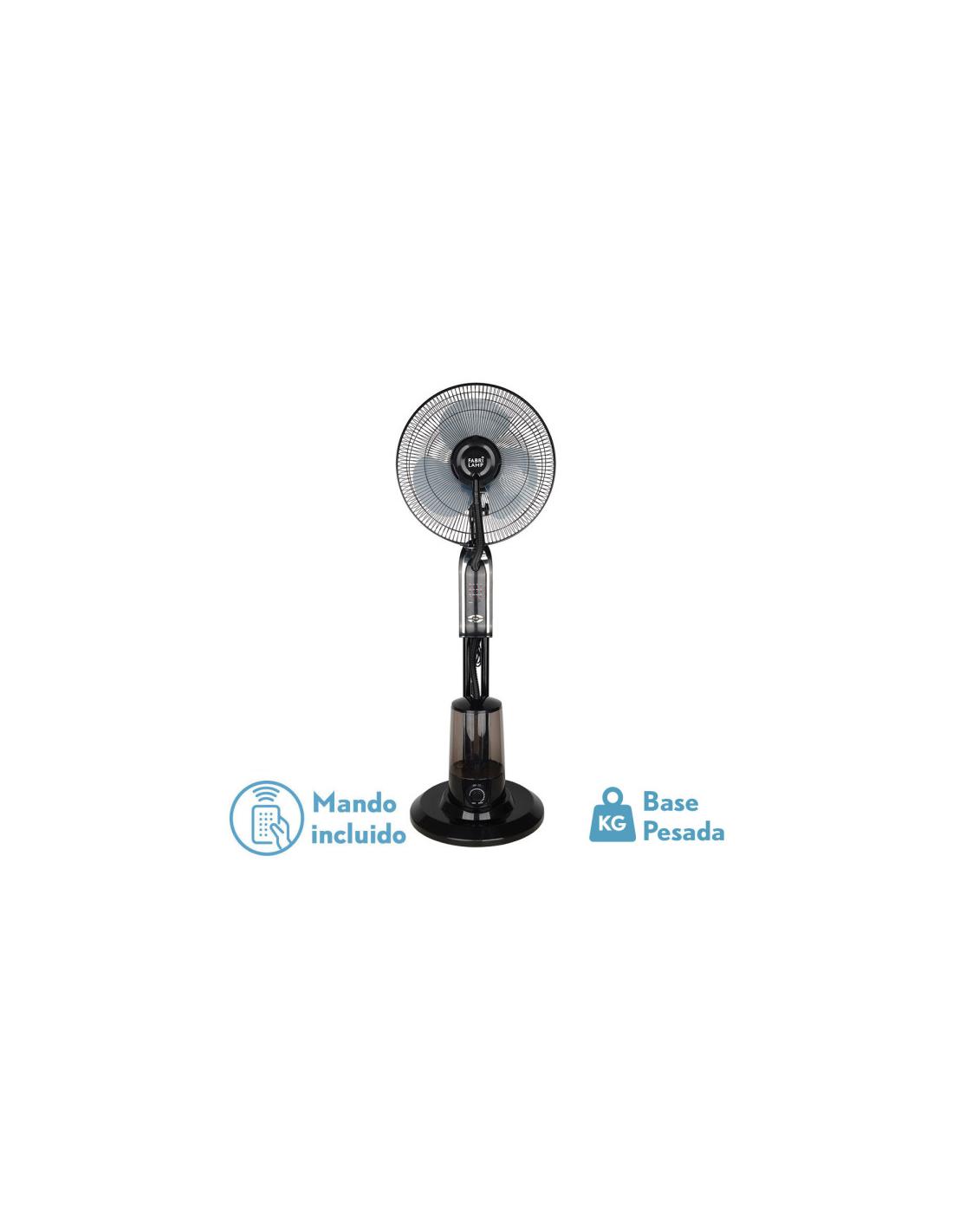 TROMBA series Standing Fan with NEBULIZER AND WATER TANK OF 3 LITERS, in BLACK color with three blades and three speeds. Thanks to its nebulizer function, it quickly refreshes and humidifies any room, ideal for terraces and patios, it sprays 200ml//h water microparticles. Made of metal and polycarbonate. AC motor. It has a power of 80 watts. Two positions, fixed and rotating, also oscillating, being able to redirect the air to the desired area. It has dimensions of 120x45x40 centimeters. Remote control INCLUDED and TIMER from 0.5 to 7.5 hours.