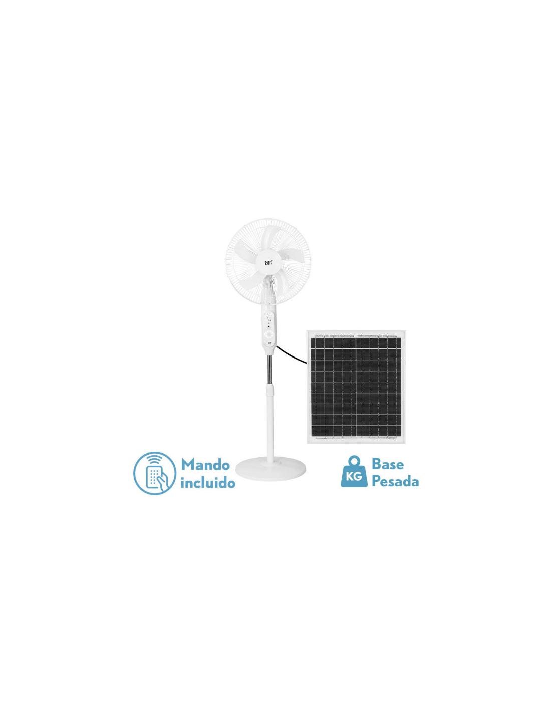 SOLAR Floor Fan from the CLIMA series made of metal, ABS and polycarbonate in WHITE color with five blades and three speeds. DC motor with a power of 30 watts. It comes with an easy-to-install SOLAR PANEL to charge your LITHIUM BATTERY and operate approximately 9H without the need to use electricity, charging time of 4-6 hours, which means great energy saving, with 4.20 METER CABLE, It also charges and works with its normal cable with a power outlet. Equipped with USB PORT to charge your mobile devices and NIGHT LIGHT to look like a reference point in dark or unlit areas. Head with two functions, fixed and rotary. It has a height-adjustable size of 120<,133x43x38 centimeters, and 2.8x40x35 centimeters its solar panel.