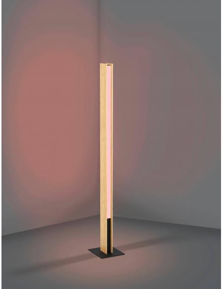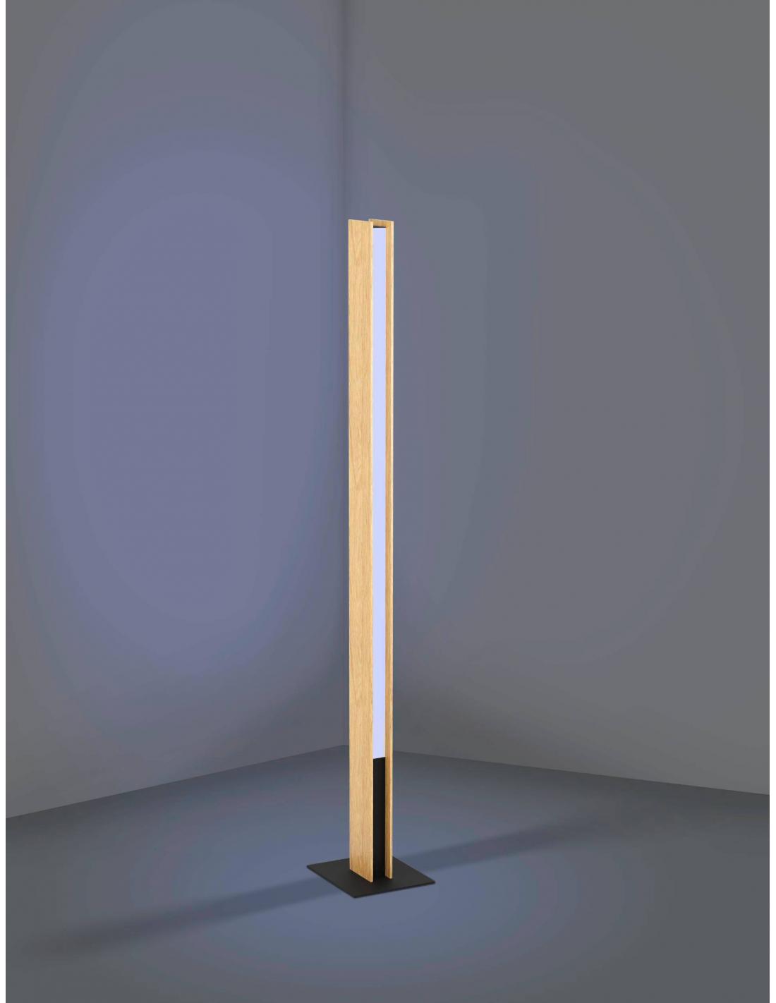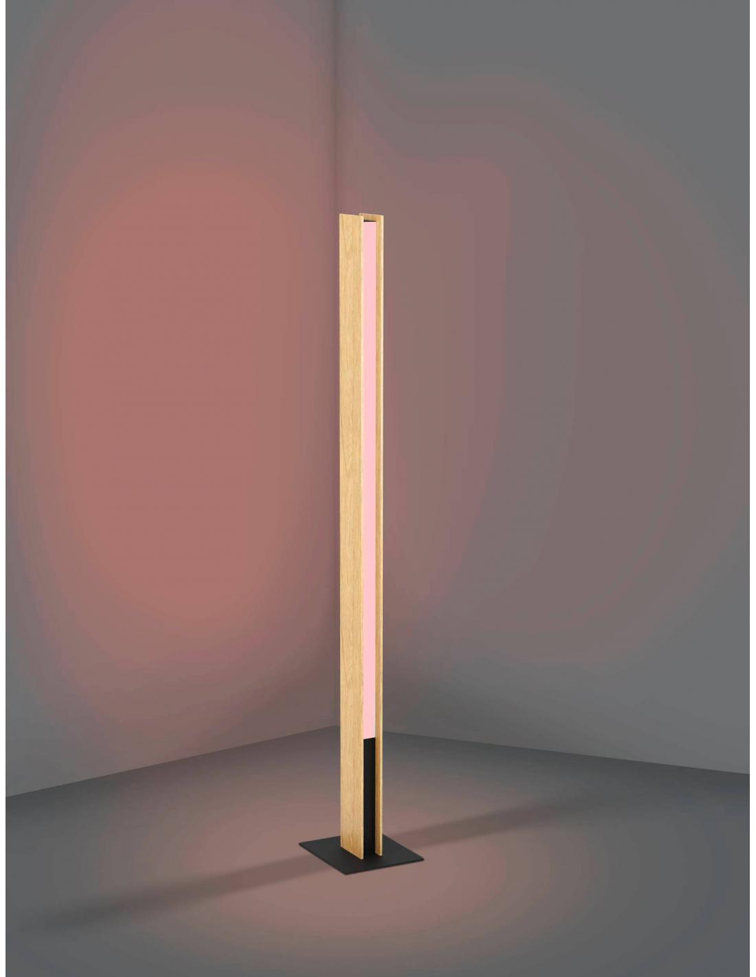Smart led floor lamp made with a black steel base and a natural wood structure. It has smart functions by which you can control it remotely, via free app, control the temperature of its light (2700-6500K) and also change its color. An elegant and minimalist floor lamp.