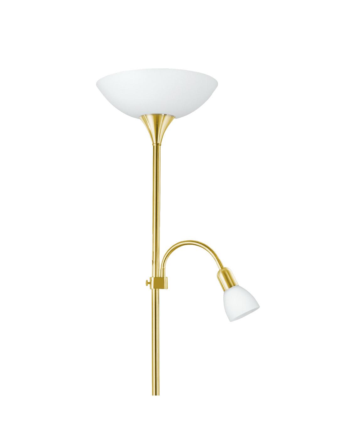 UP 2 is a floor lamp with an articulated arm in gold. The upper shade is made of acrylic and uses an E27 bulb. The shade of the flexible arm is made of glass and uses an E14 bulb. BULBS NOT INCLUDED.