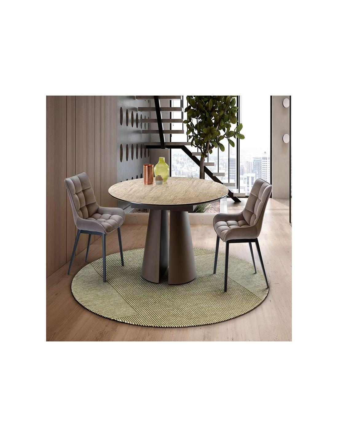 Round dining table, structure made of metal and MDF finished in brown oxide. MDF top with high resistance melamine surface, travertine finish, with edges in brown oxide.