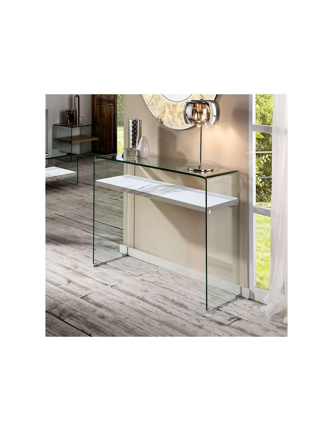 Console made of transparent, tempered and curved glass of 12 mm. DM shelf, white marble-like finish.