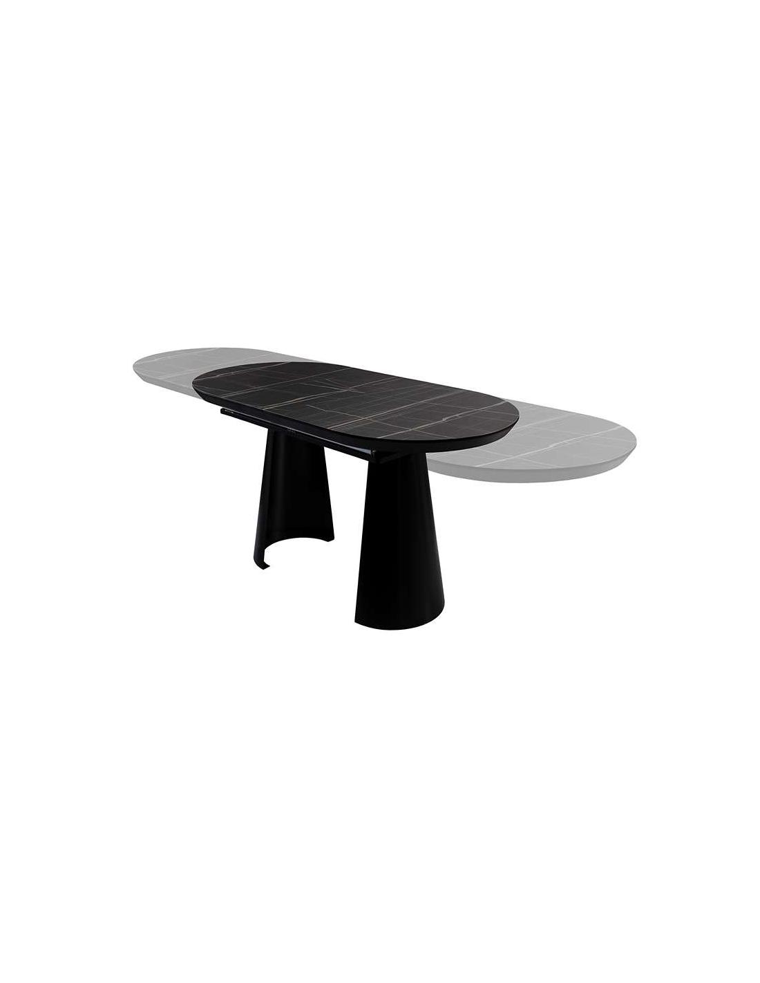 Extendable dining table, made of metal with a matte black finish and a DM top with a high-strength melamine surface, glossy black marble finish, with matte black edges. Extendable up to 4 meters.