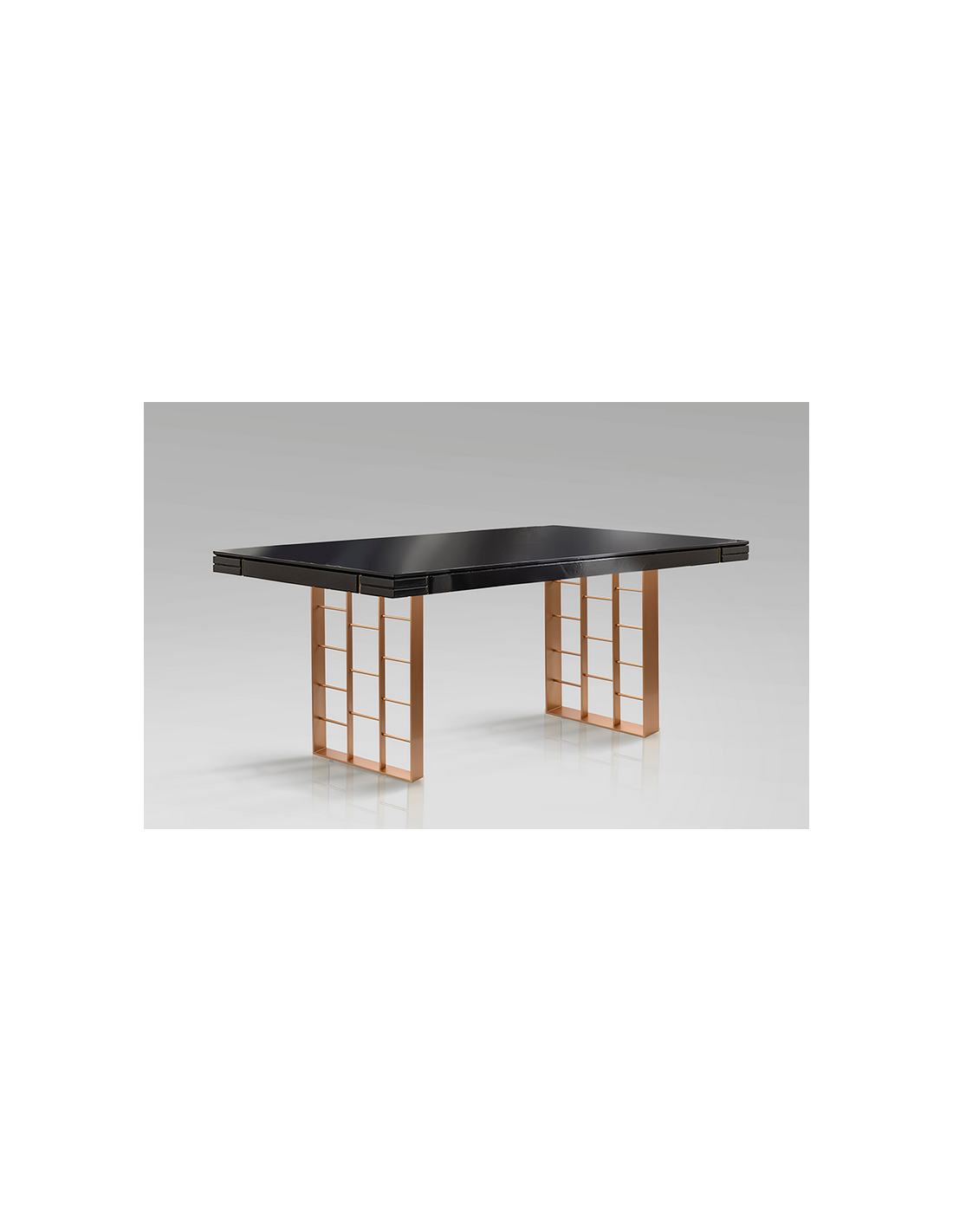 Dining table made of DM anthracite gray finish, glossy lacquered, with decorative grooves and gold plates. Metal legs with matte rose gold paint finish.