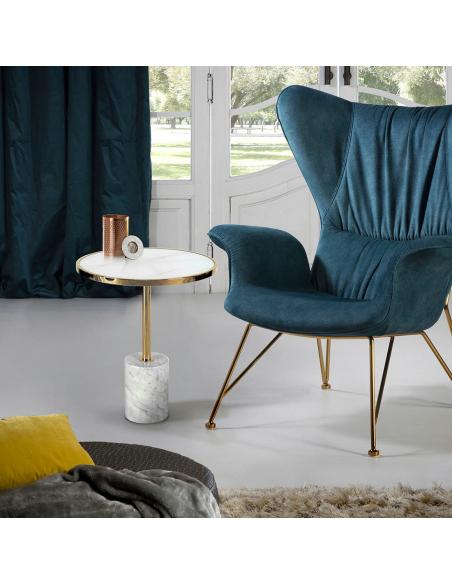 Side table made of gold-finished stainless steel. White marble base and tempered glass top with white marble imitation finish.