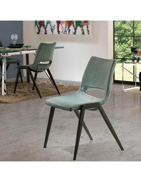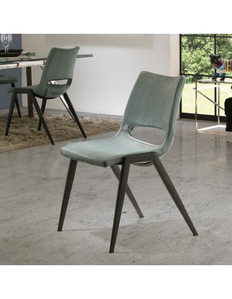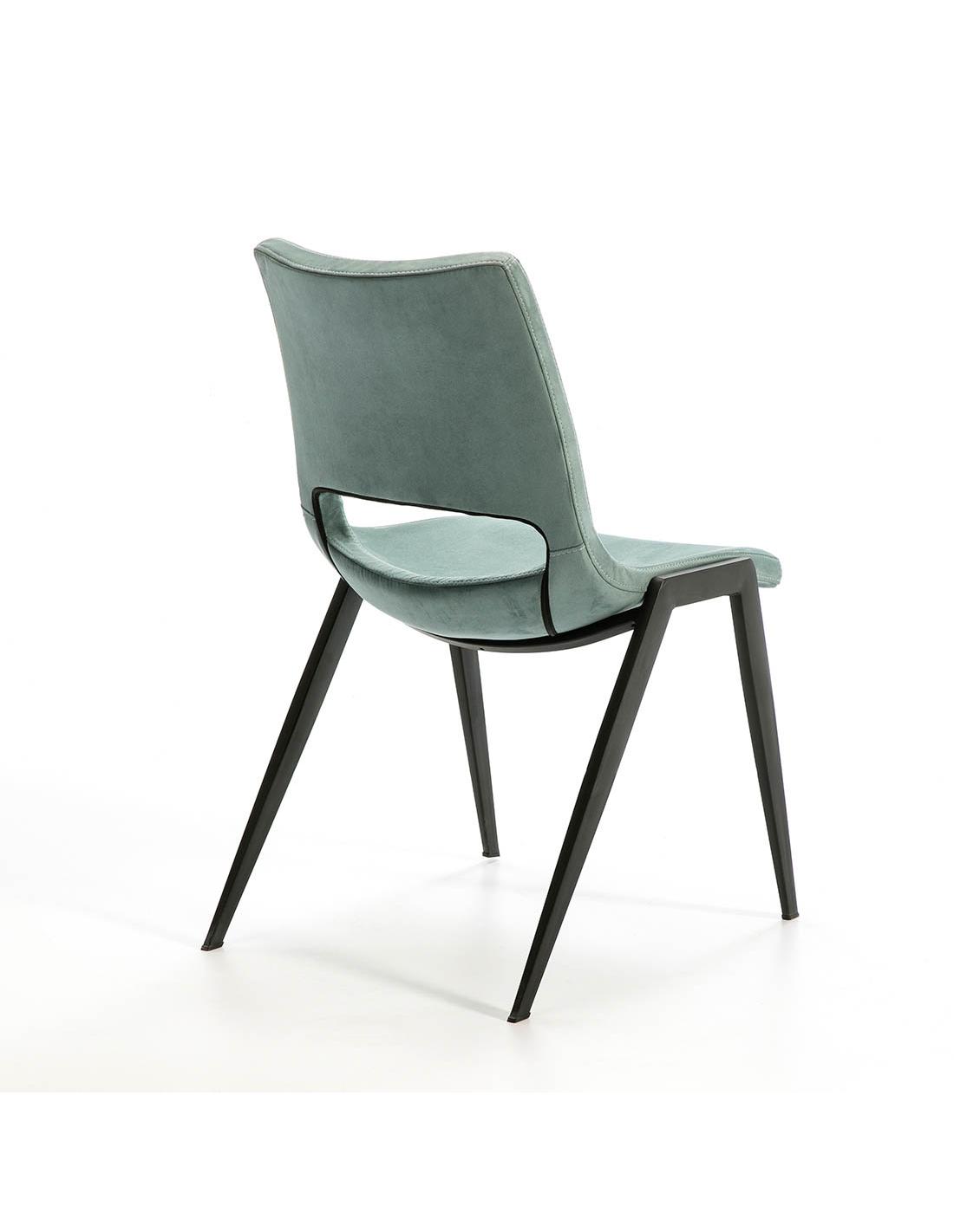 Chair made of metal, matte black finish. Seat and backrest made of plywood and injected polyurethane foam. 100% aquamarine blue water-repellent polyester suede textile upholstery. Dry cleaning.