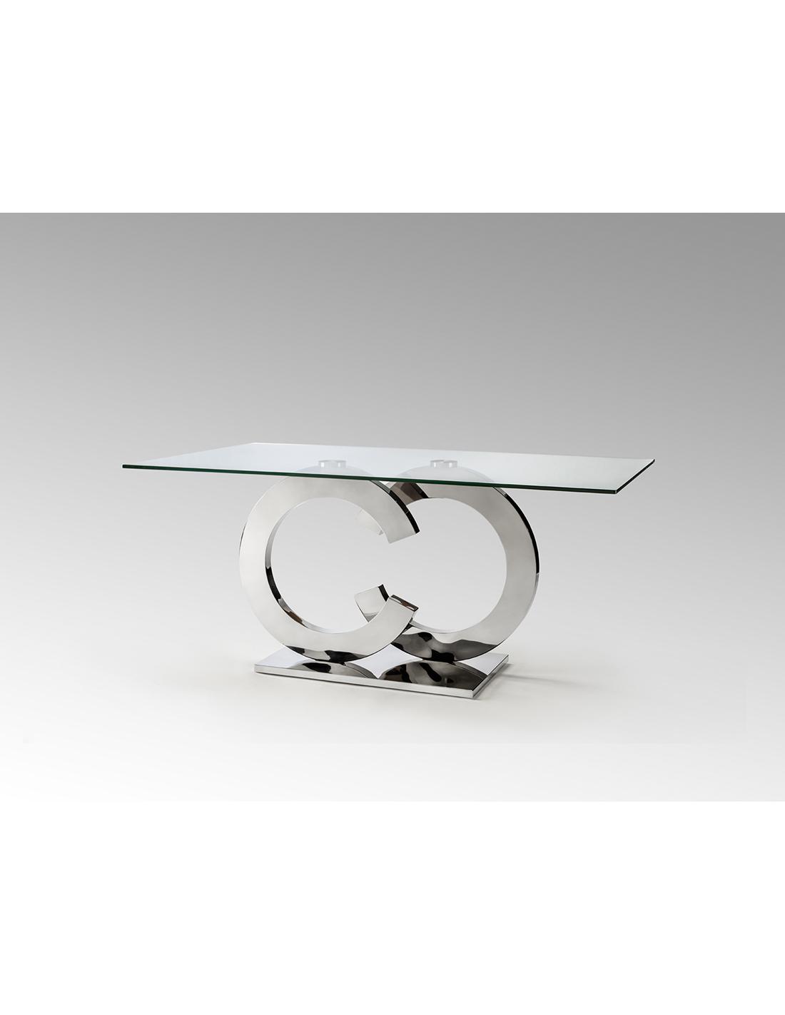 Rectangular dining table made of stainless steel and 12 mm thick safety glass top with polished edge.