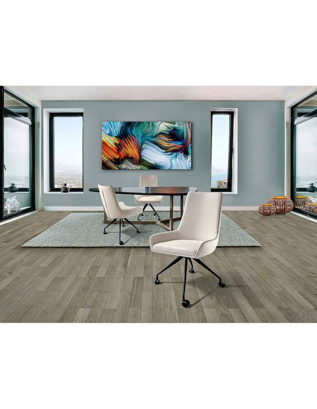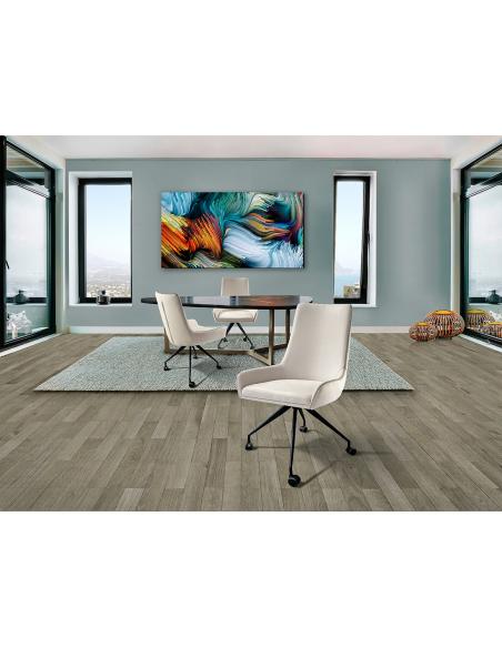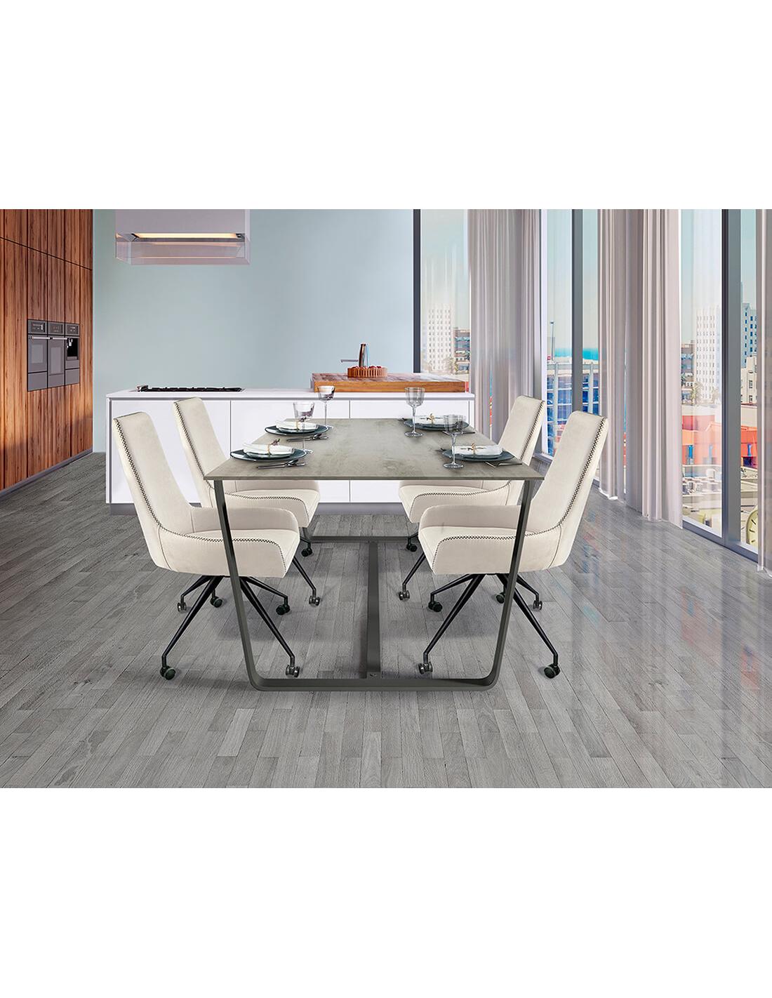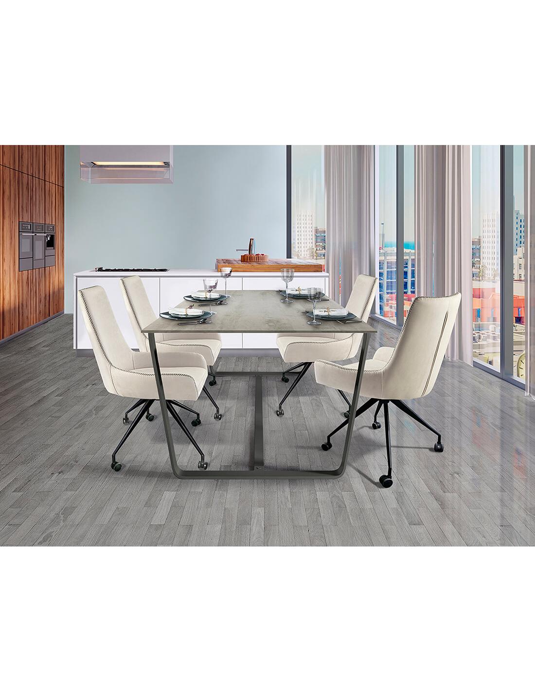 Chair with swivel wheels, made of metal, matte black finish. 100% polyester textile upholstery in white color, with decorative gray stitching.
