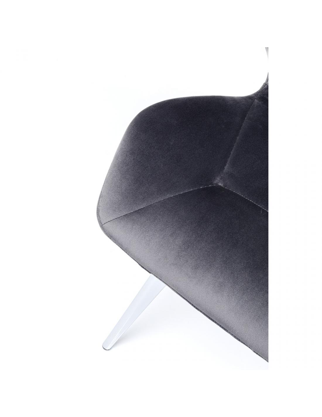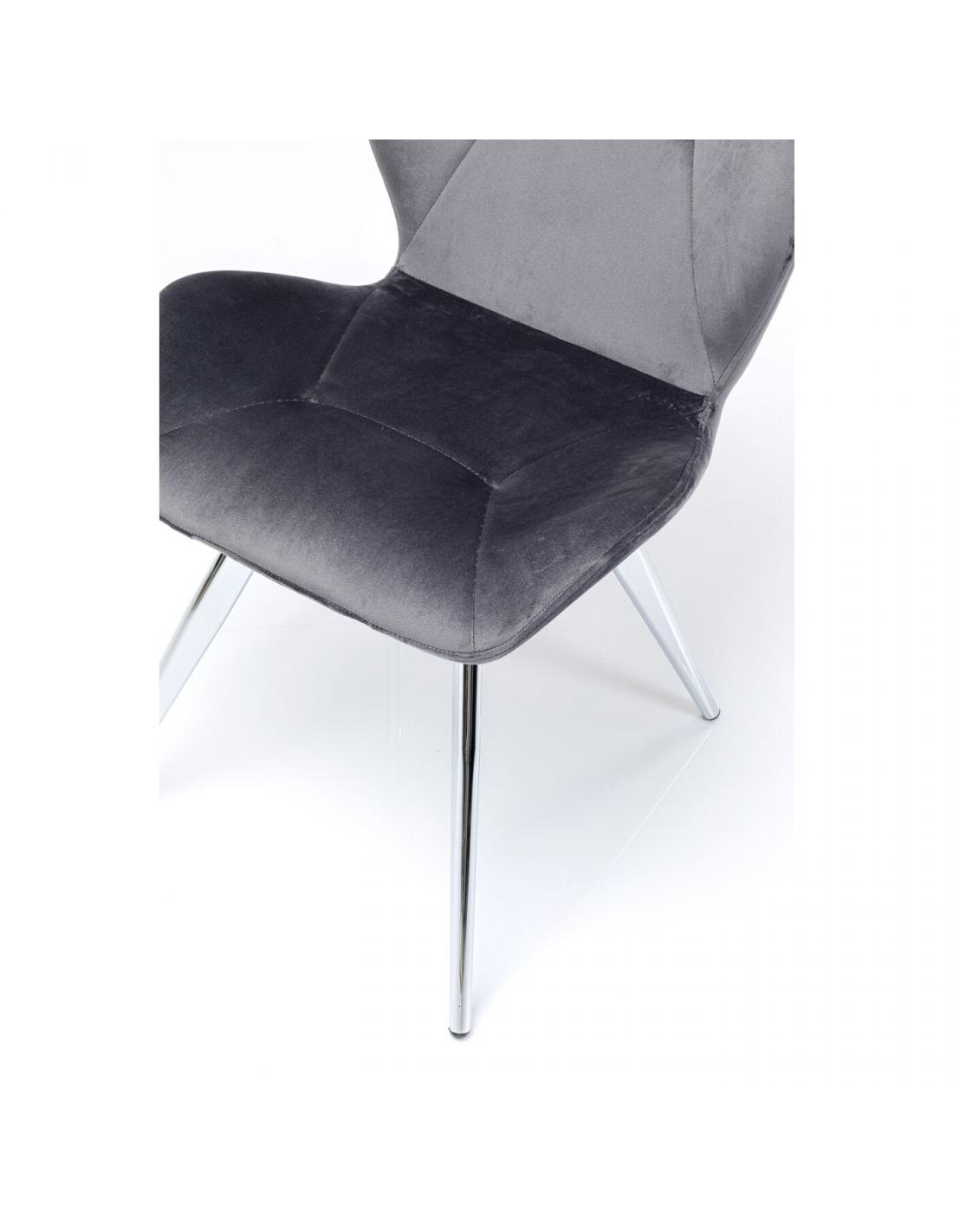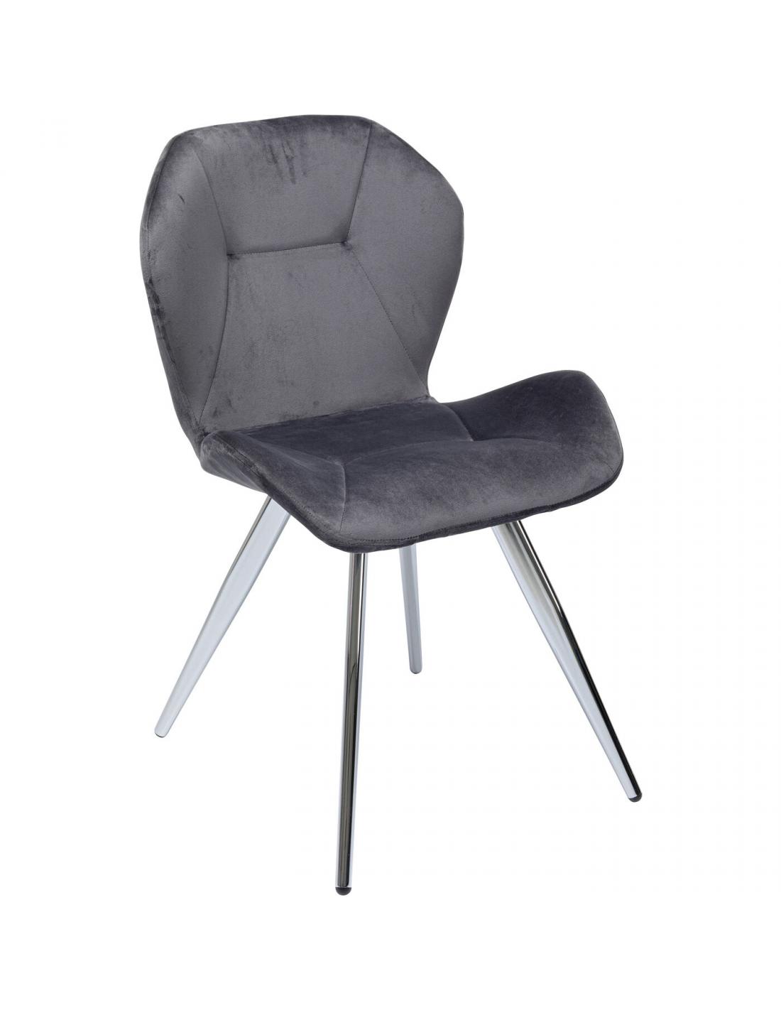 An elegant and designed dining chair with a diamond-shaped backrest upholstered in gray velvet with steel legs in silver finish. A very special piece that cannot be missing in your dining room.