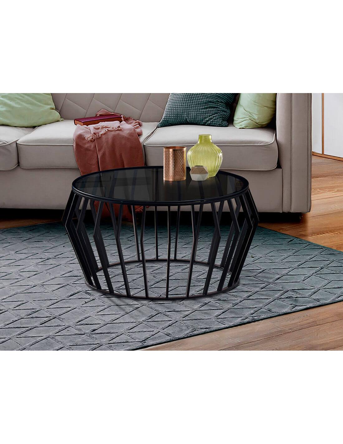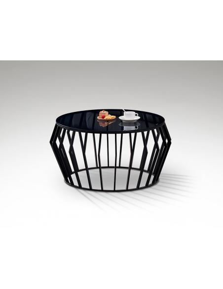 Coffee table made of matte black finished metal. 8 mm smoke glass lid.