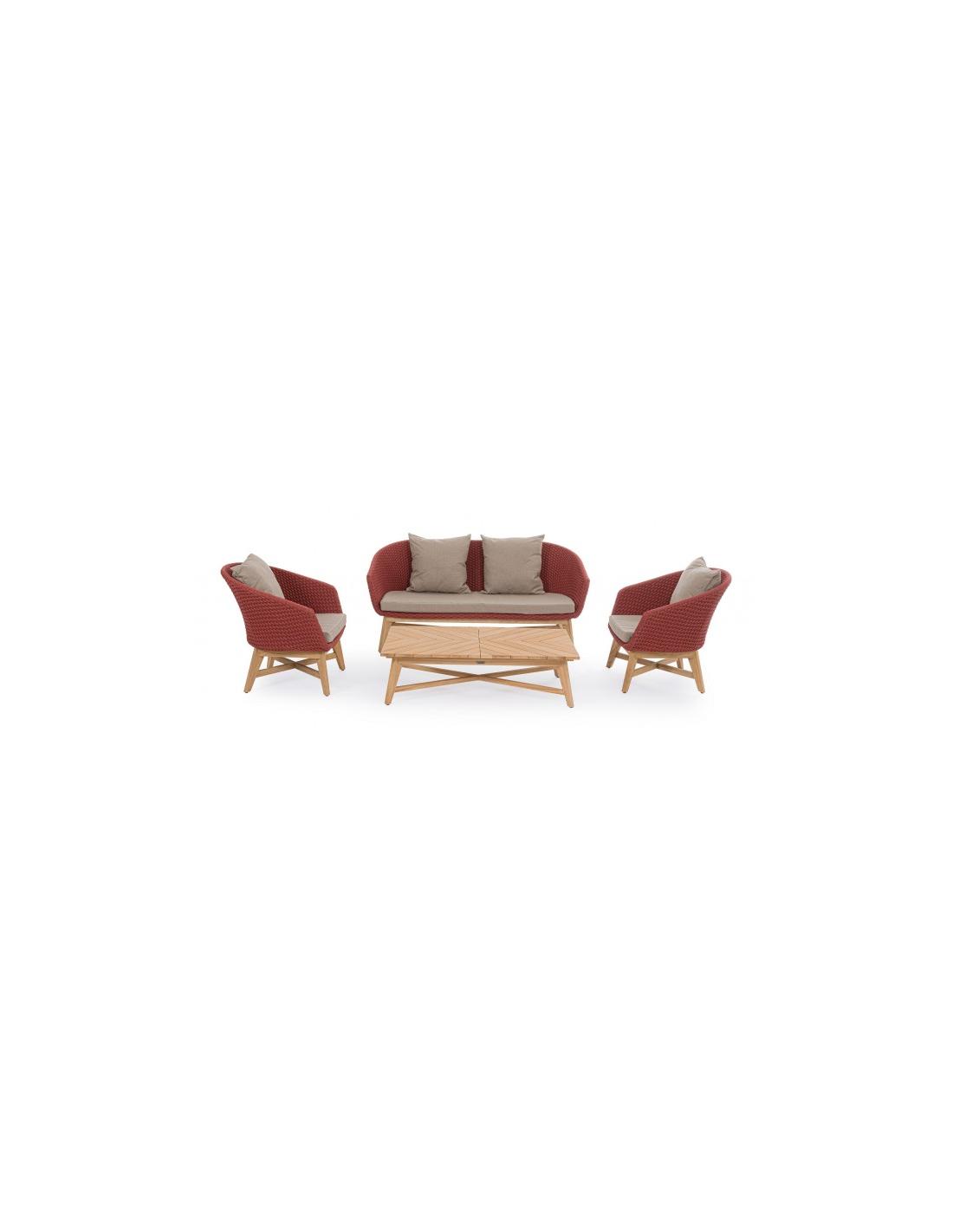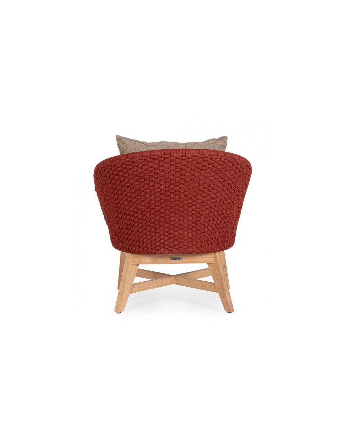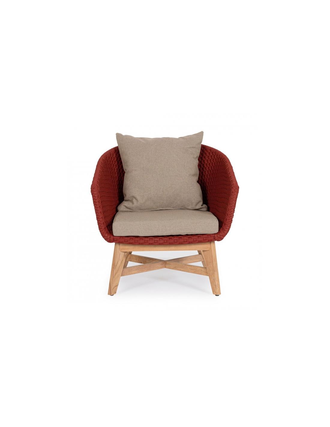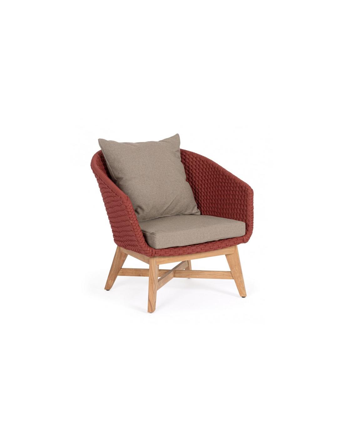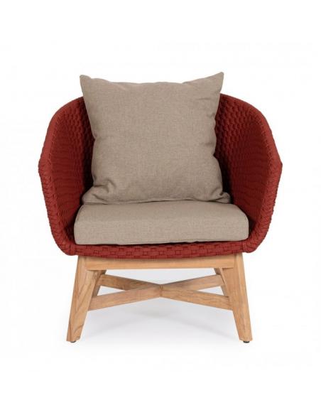 Seat with powder-coated aluminium structure (polyester). Olefin rope braiding (100% polypropylene). Removable seat and back cushion made of sunproof olefin fabric (100% polypropylene). Teak legs - svlk (certified wood from sustainable forests). Galvanized steel screws. Legs to assemble.