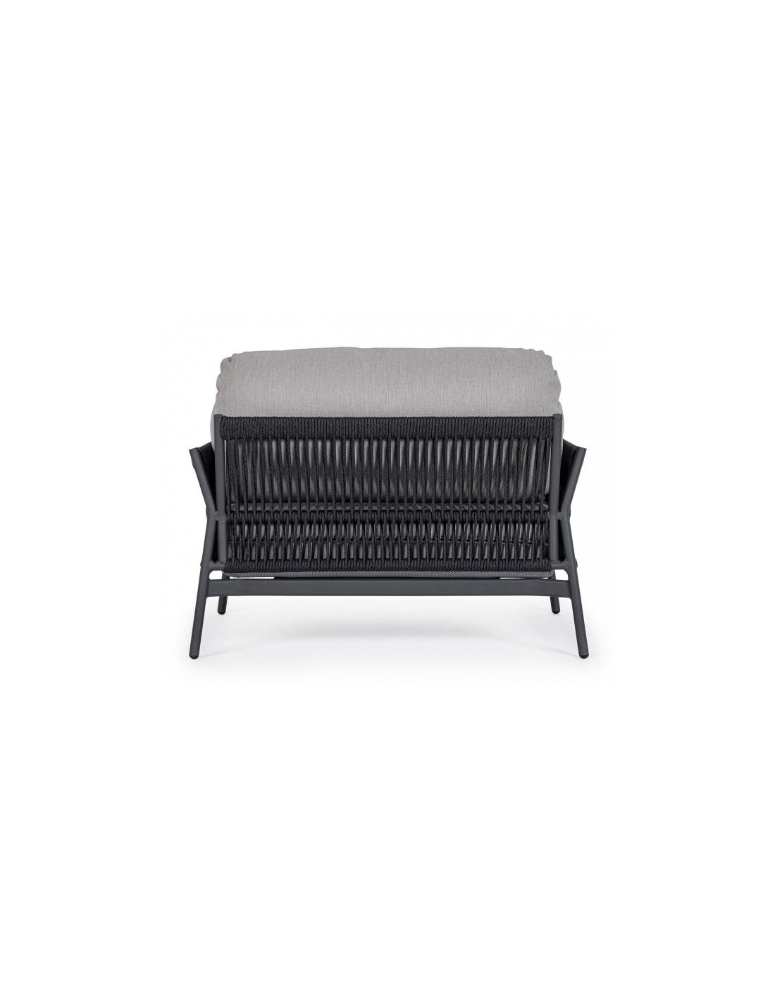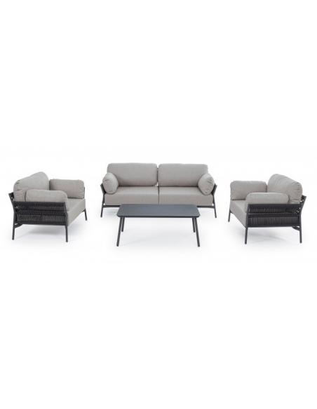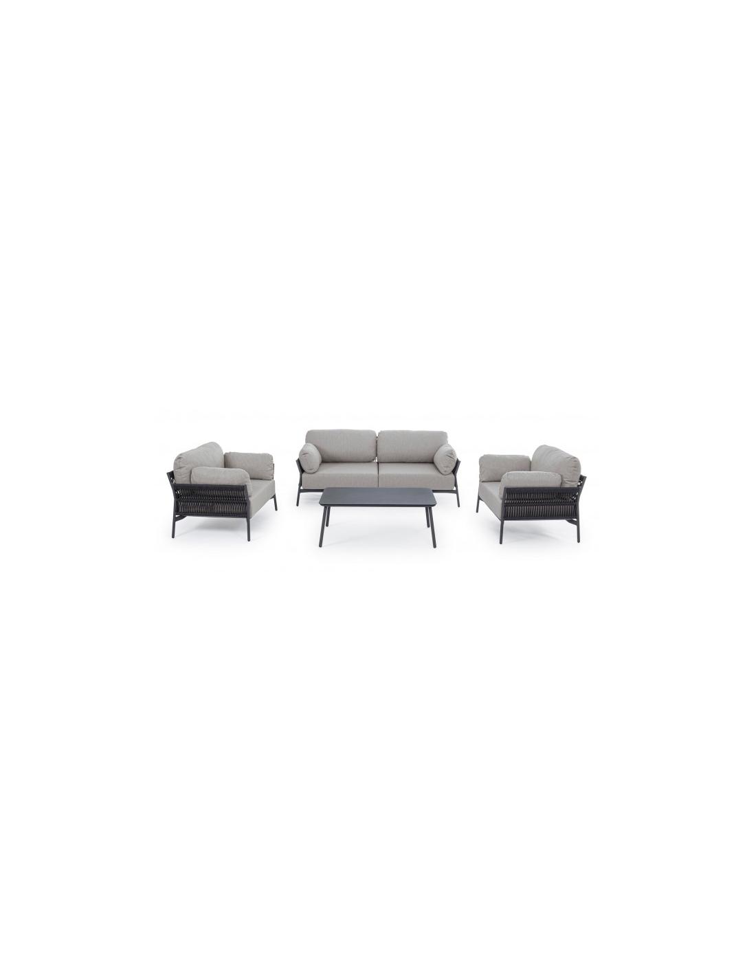 Structure in powder-coated aluminium (polyester). Olefin rope braiding (100% polypropylene). Removable seat and back cushions made of olefin fabric (100% polypropylene).