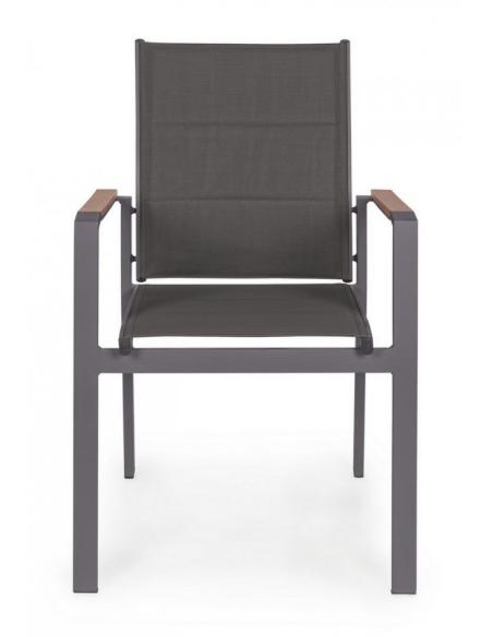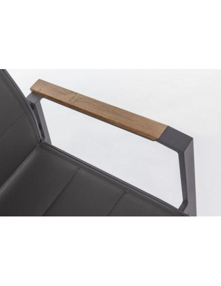 Aluminum structure, with powder coating (polyester). Arms with polywood applications. Seat and back covering of textilene 2x2 (with padding). Stackable.