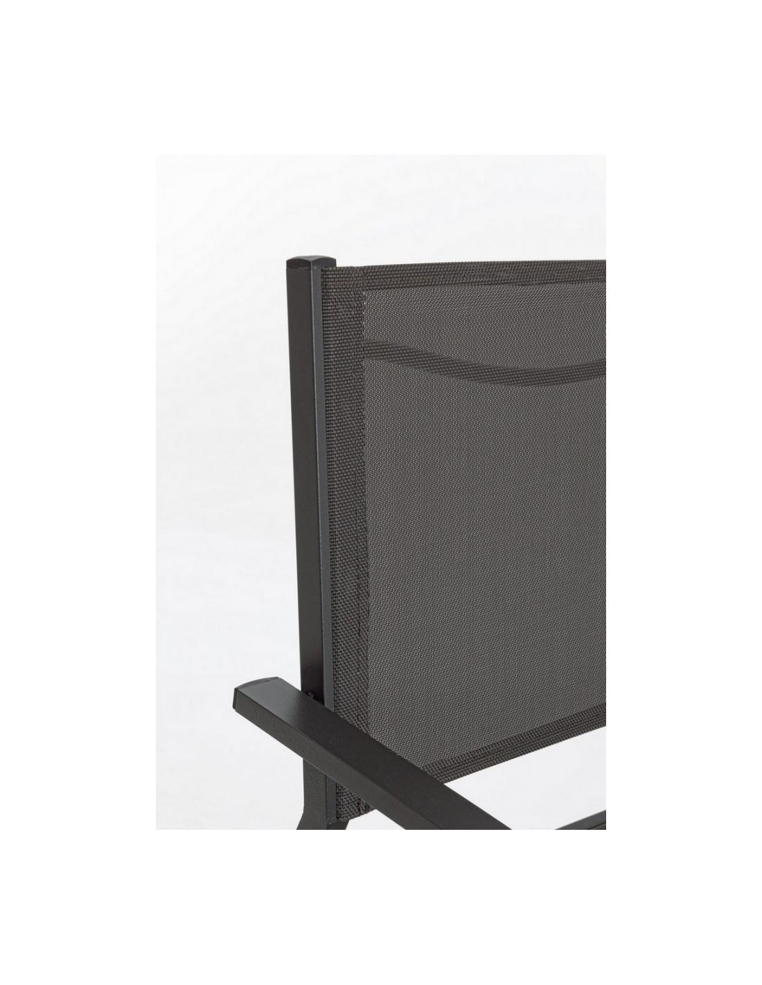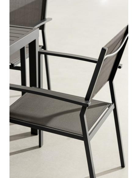 Aluminum structure, with powder coating (polyester). Textilene seat and backrest 2x1. Galvanized steel screws. Stackable. Packaging without cardboard box.