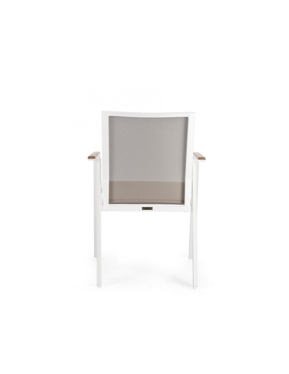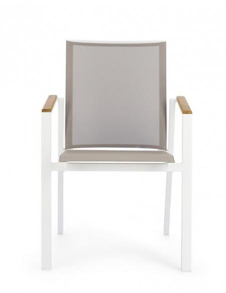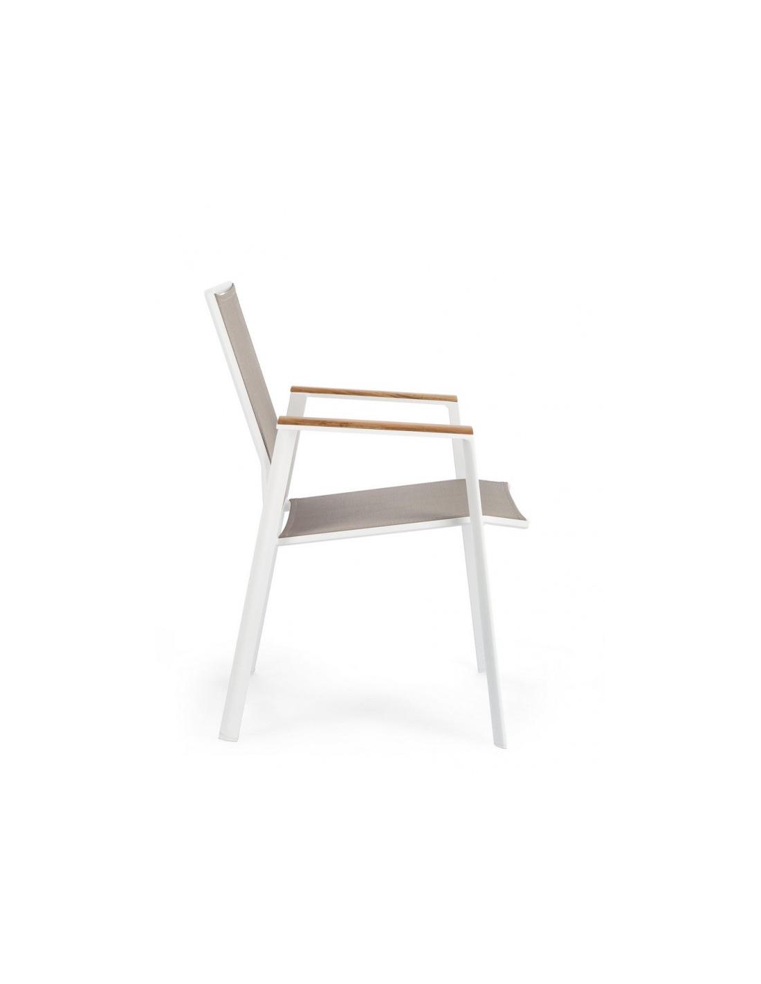 Aluminum structure, powder coated (polyester). Arms with teak wood applications. Textilene phifer 1x1 seat and backrest. Stackable.
