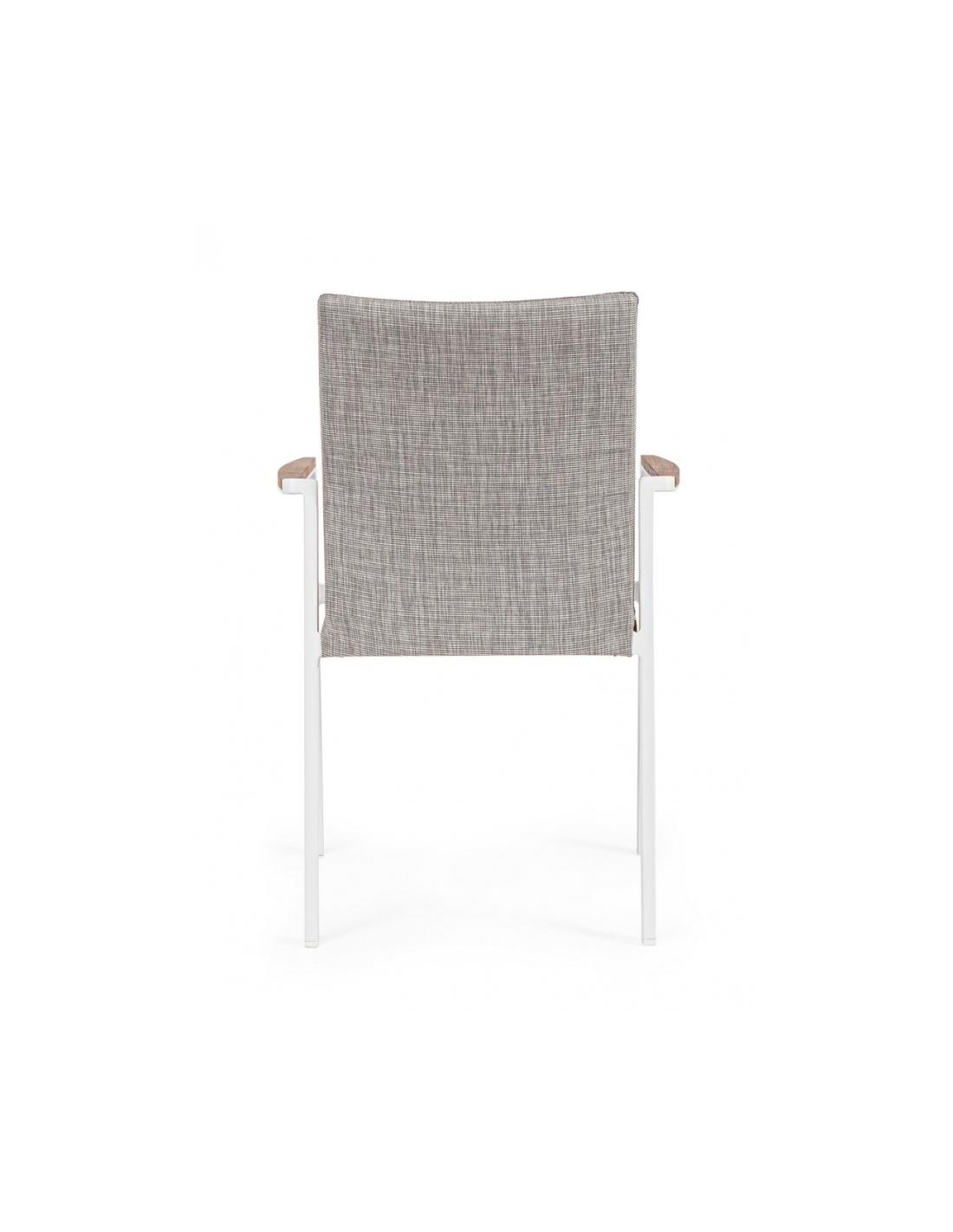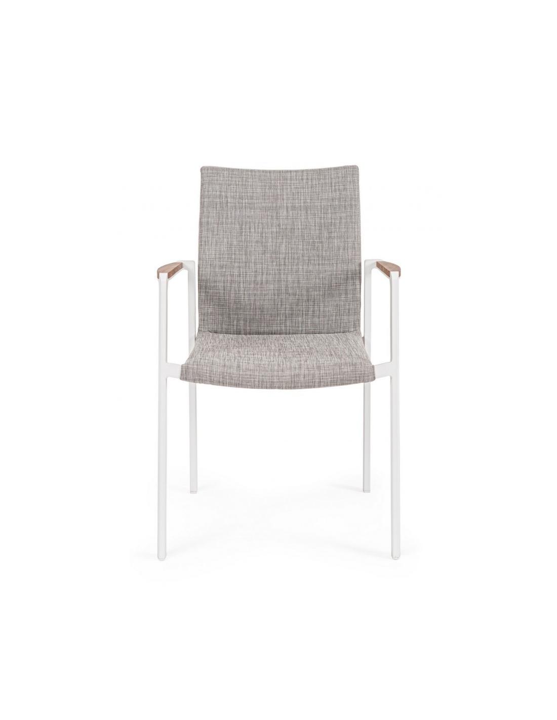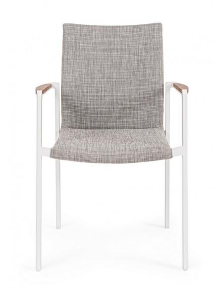 Powder-coated aluminium (polyester). Armrests with teak inserts. Seat and back covering with outdoor fabric (70% cotton 30% olefin), fast dry foam filling. Stackable.