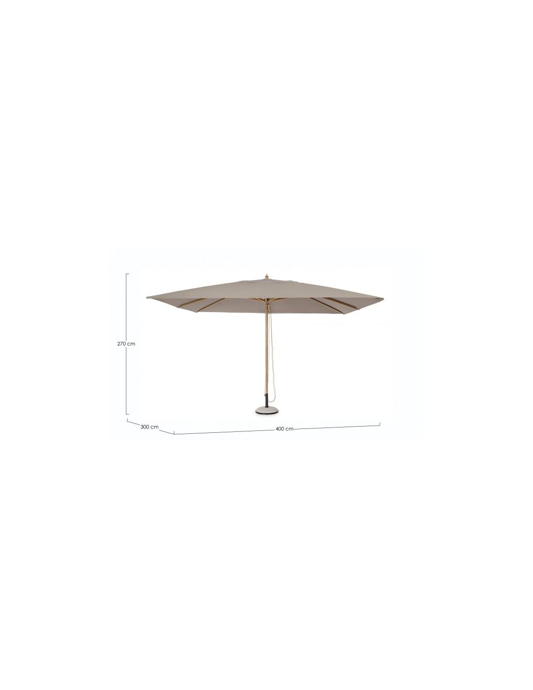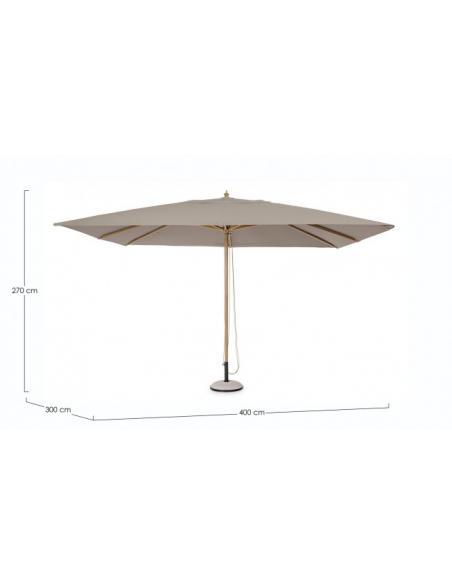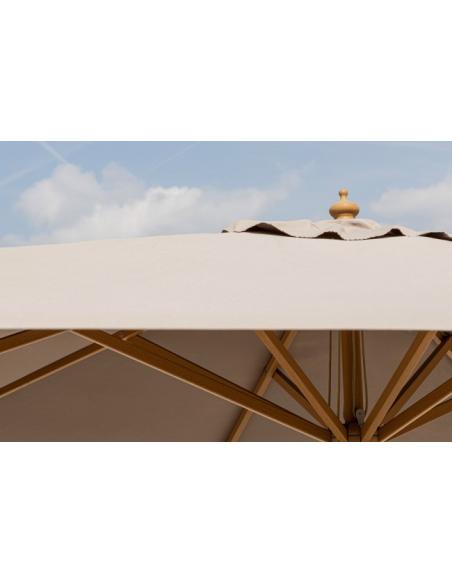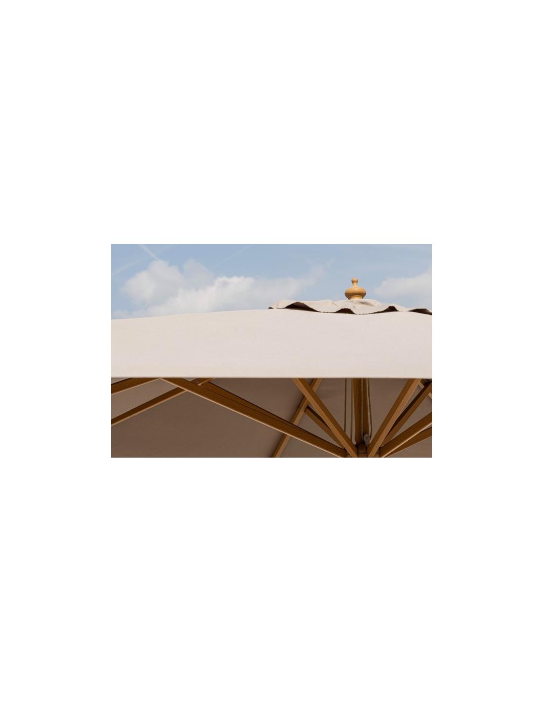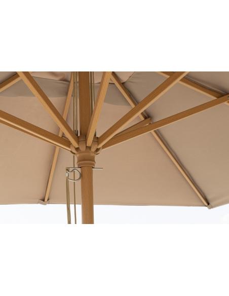 Aluminum structure finished with wood effect. Plastic crown. Stick ø48x1. 8mm. 8 rods 20x35mm. 235g/m2 polyester tarpaulin with windproof chimney. Base not included.