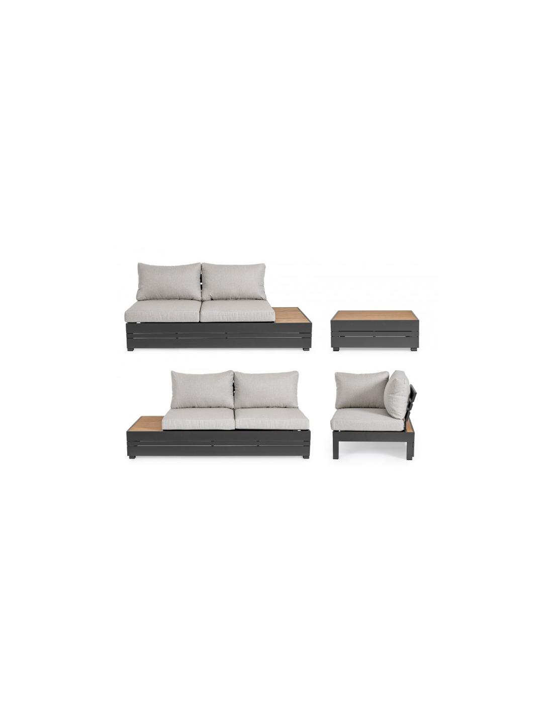 Structure in powder-coated aluminium (polyester). Sides and top of polywood (composite material with a wood-like appearance) 90% polystyrene 10% sbs teak color. Removable cushions made of polyester fabric. Galvanized steel screws. Backrests to assemble.