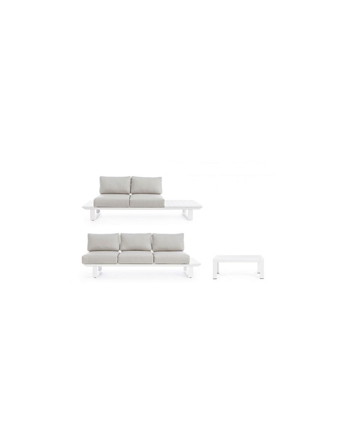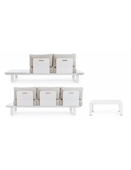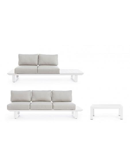 Aluminum structure with powder coating (polyester). Removable cushions made of olefin fabric (100% polypropylene). Legs and backrests require assembly.