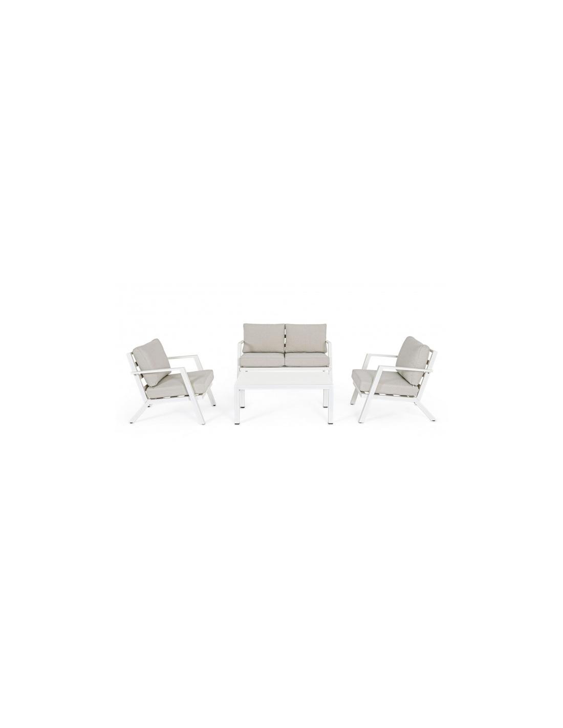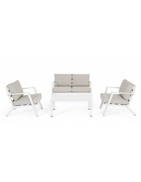 Powder-coated aluminium (polyester). Removable seat and back cushions with olefin fabric (100% polypropylene). Adjustable feet. Stainless steel screws. To assemble.