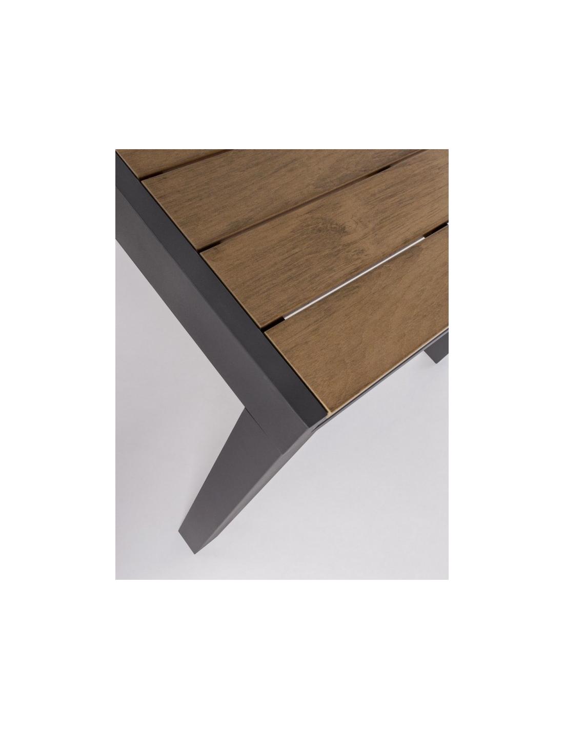 Aluminum structure with satin steel finish. Polywood board (composite material with a similar appearance to wood) 90% polystyrene 10% sbs teak color. Foldable and foldable extension. Galvanized steel screws. It is advisable not to cover the table (during prolonged periods) with materials that do not allow air recirculation (such as plastic/PVC covers or towels).